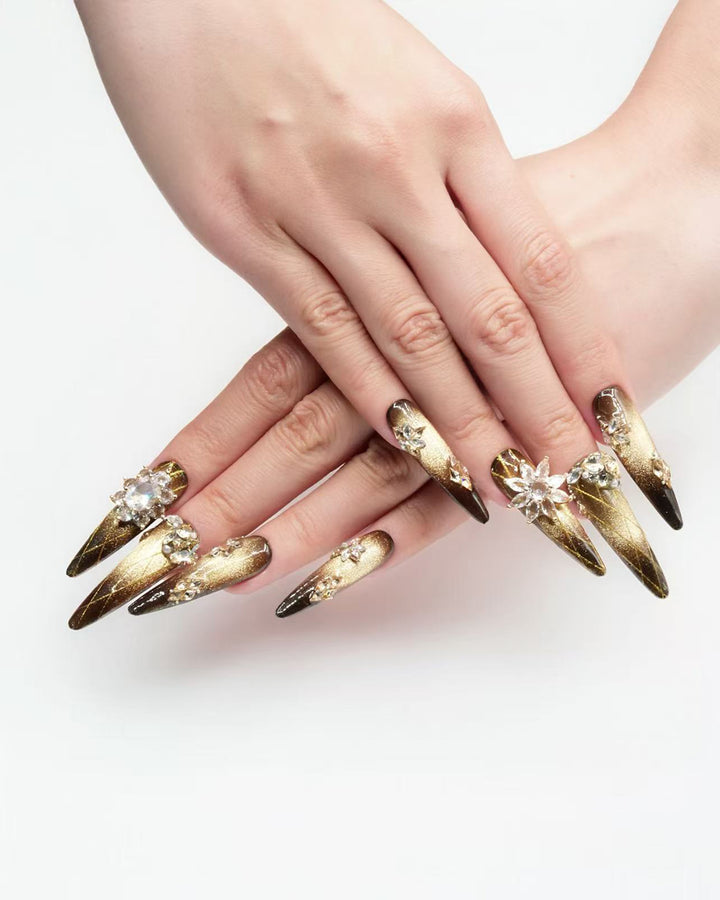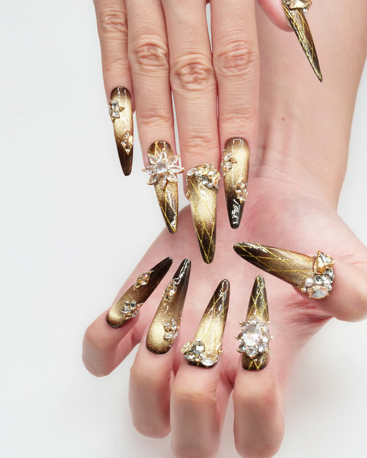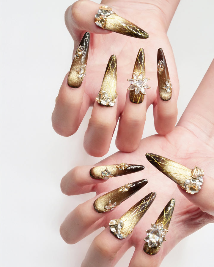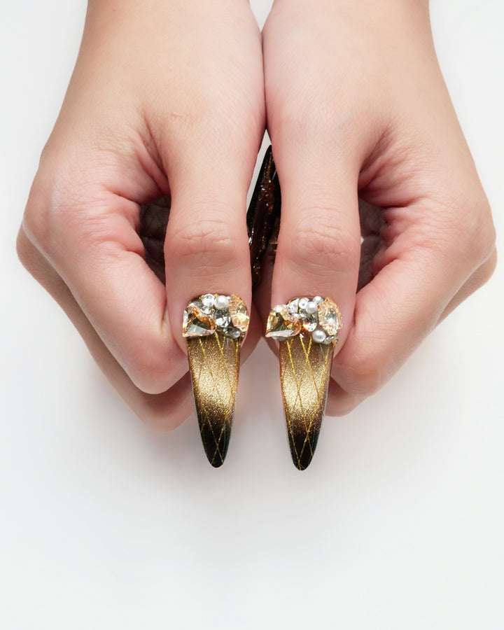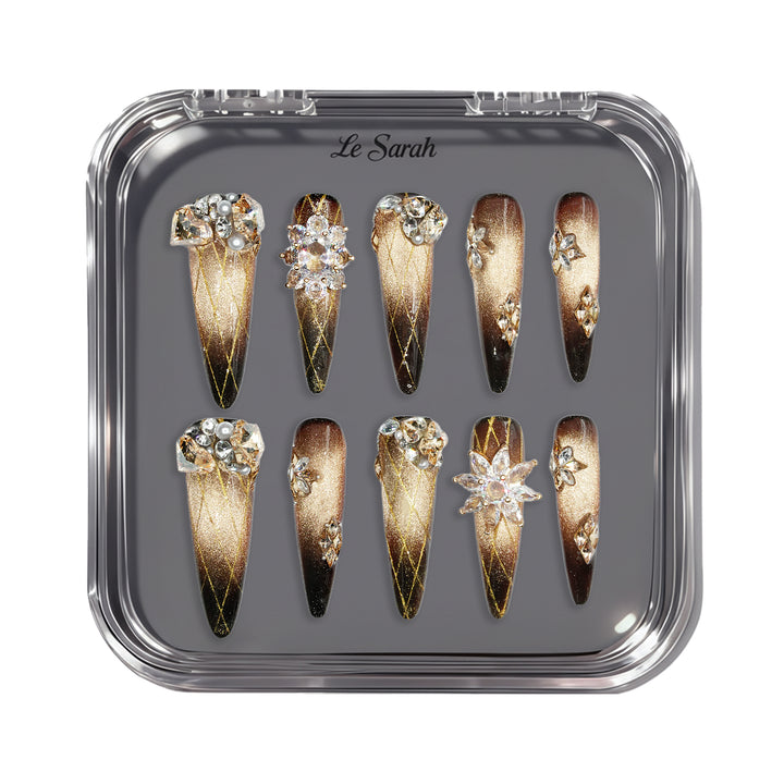 Le Sarah's Aurora Dawn from the Fine Jewelry collection is a breathtaking blend of dawn's radiance and opulent artistry. This design showcases a gradient of warm, golden-brown hues, adorned with shimmering crystal details, delicate pearl-like accents, and intricate decorative elements. Evoking the ethereal beauty of the aurora at daybreak, these nails bring an air of elegant luminosity and sophisticated charm to your look, perfect for adding a touch of celestial glamour to any ensemble.