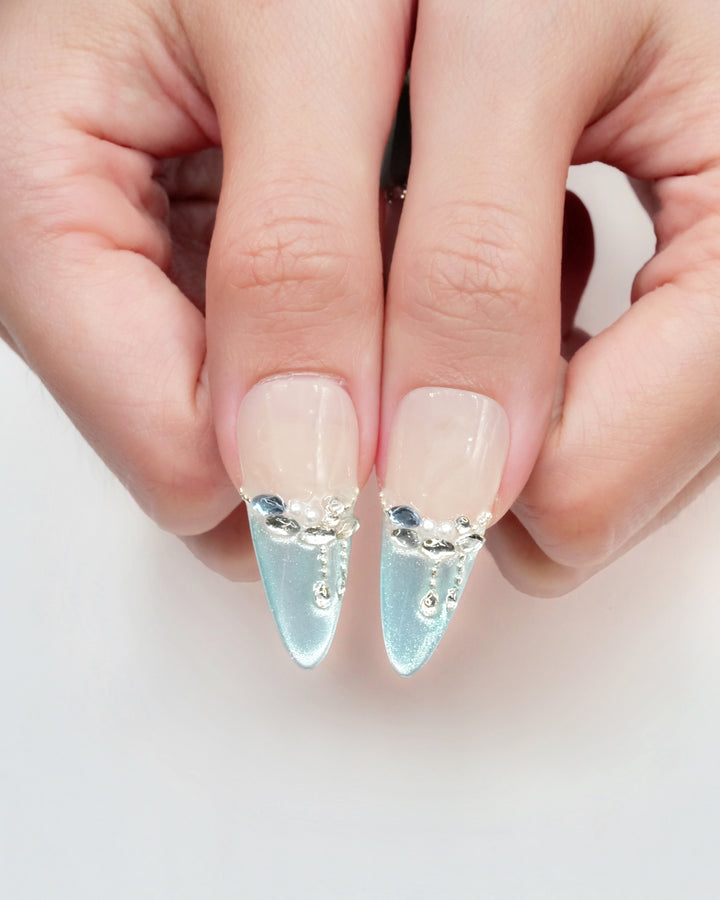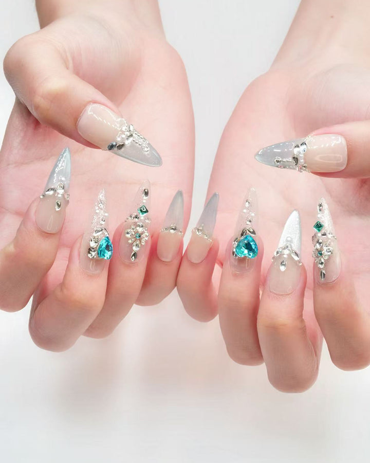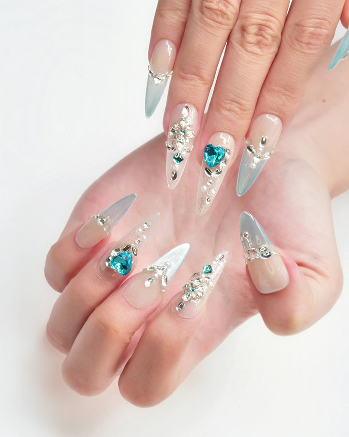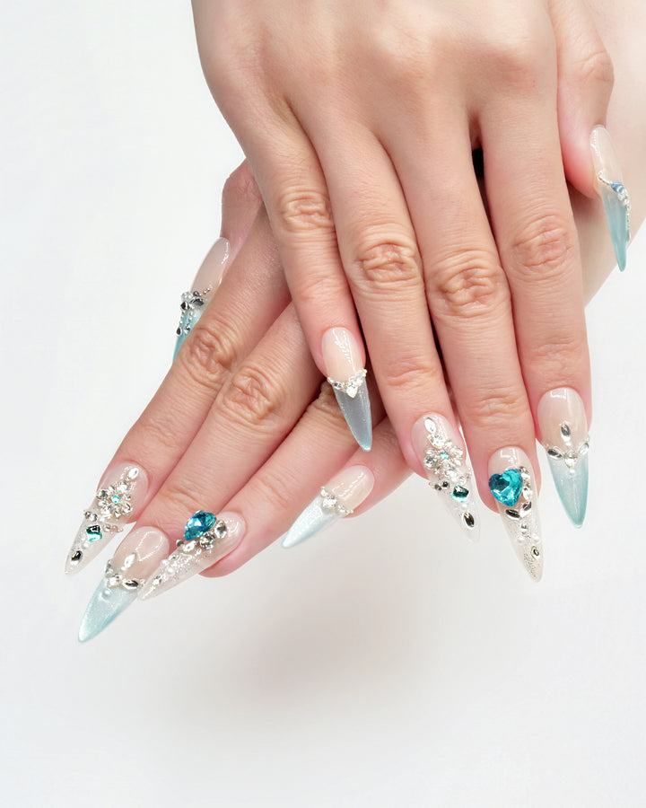 Le Sarah's Azure Dream, a vibrant piece from our Elevated French Collection, merges cool-toned elegance with whimsical charm. This design features crisp white bases adorned with gradient azure accents and sparkling crystal details, evoking the serenity of a dreamy sky. Capturing the essence of refreshing sophistication, these nails bring a lively, eye-catching charm to any look, perfect for those who love to infuse classic style with a burst of color.
