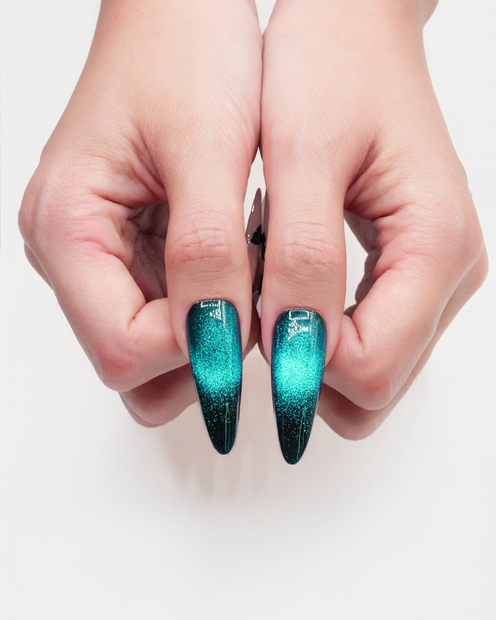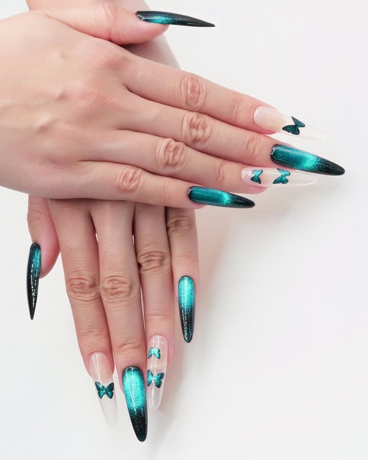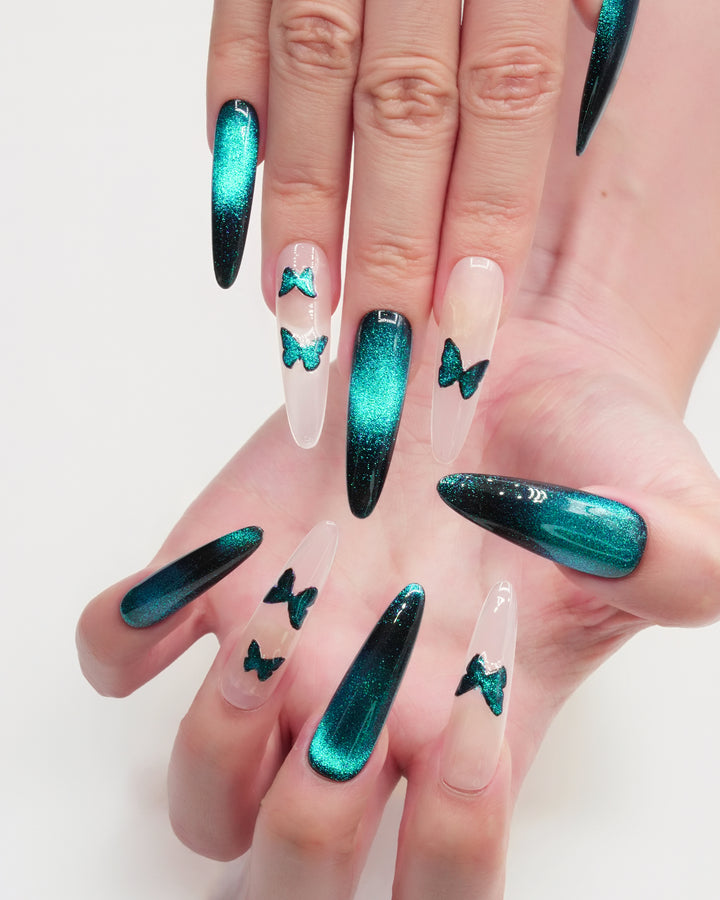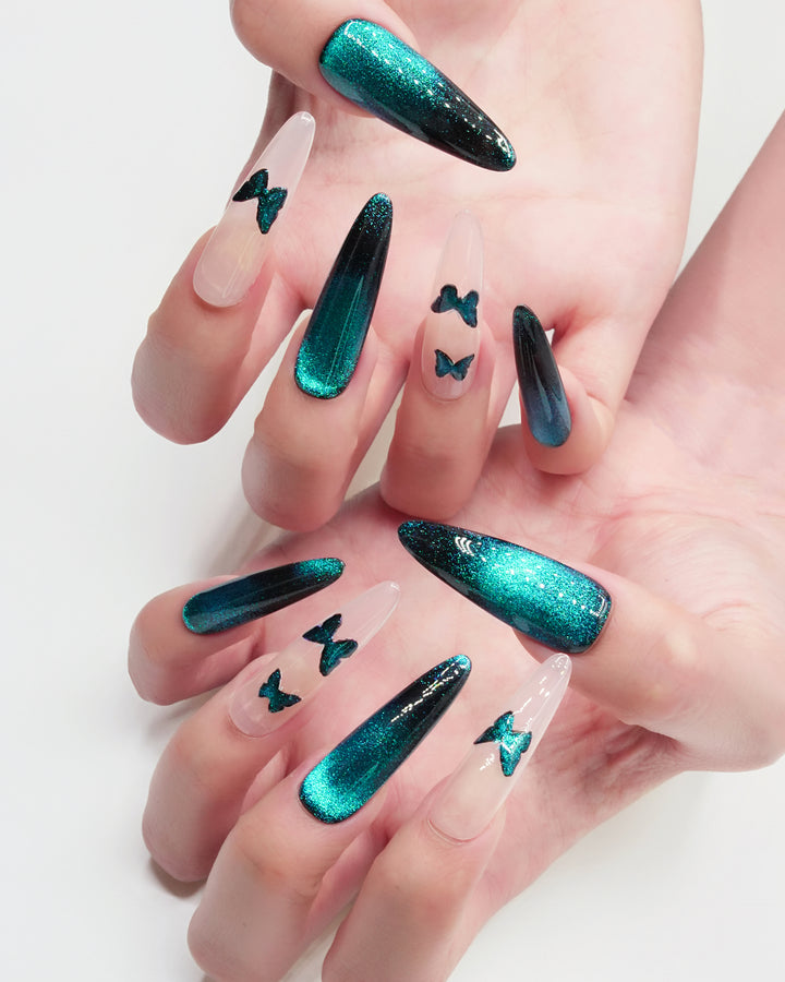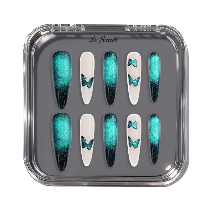 Le Sarah's Azure Enchantress embodies the mystical allure of nature's waters. Part of our Natural Collection, this design features striking azure - to - dark gradient hues, whimsical butterfly motifs, and shimmering glitter details. Evoking the serenity of a deep forest stream and the grace of fluttering butterflies, these nails add a magical, elegant touch to your look.