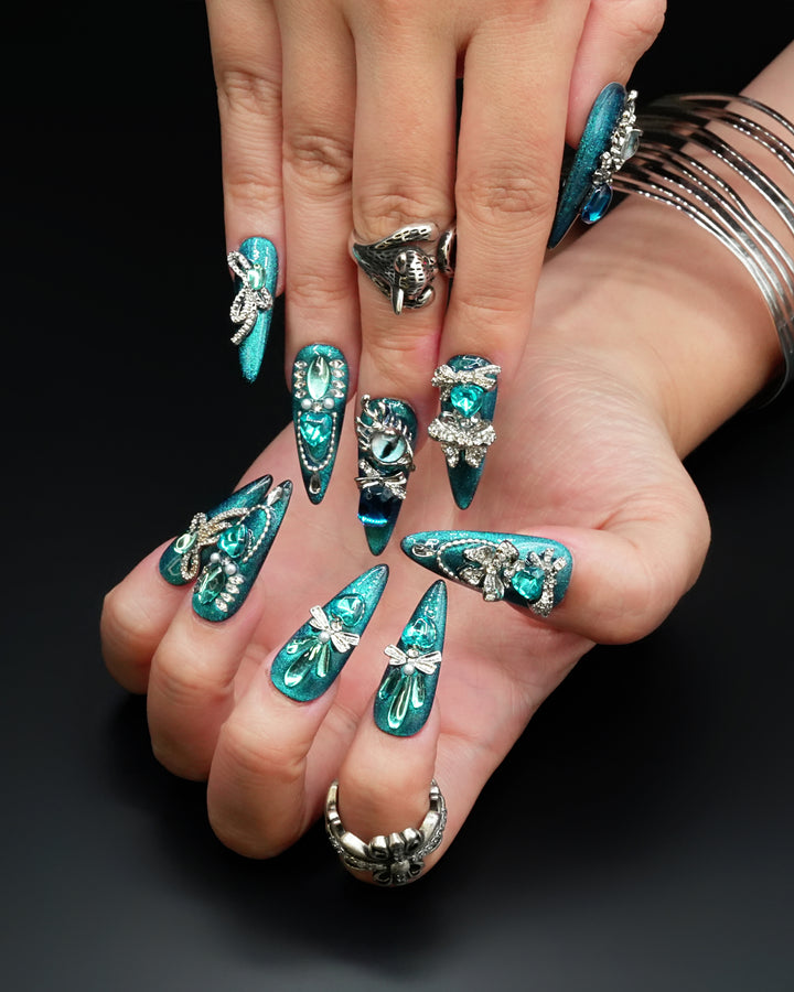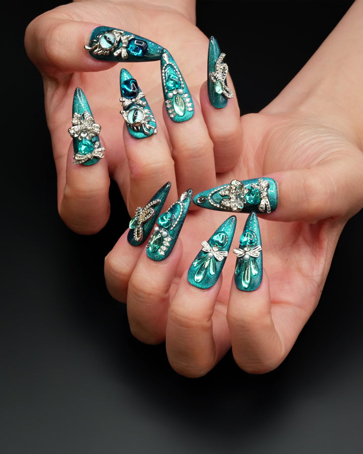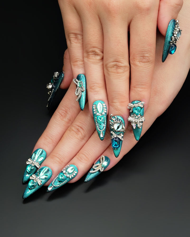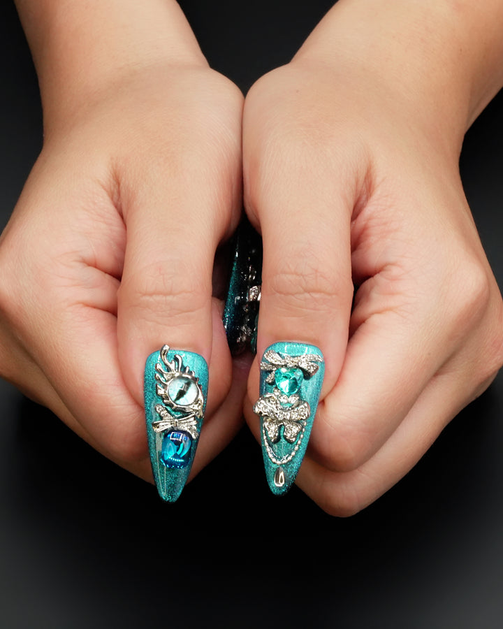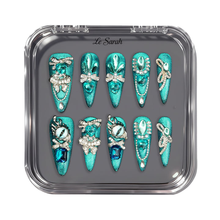 Le Sarah's Beyond Horizon, a captivating creation from our SCI-FI Collection, launches you into a futuristic aquatic dimension. This design showcases a vibrant teal gradient base, embellished with intricate 3D nautical-inspired motifs, luminous pearl details, and sparkling gem accents reminiscent of cosmic ocean treasures. Capturing the mystery of uncharted interstellar seas and the innovation of sci-fi exploration, these nails bring a bold, avant-garde aquatic edge to your look, ideal for those seeking to make a statement at tech-inspired events or infuse their style with otherworldly maritime flair.