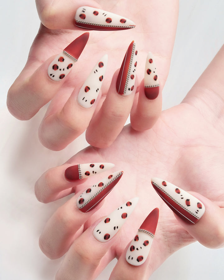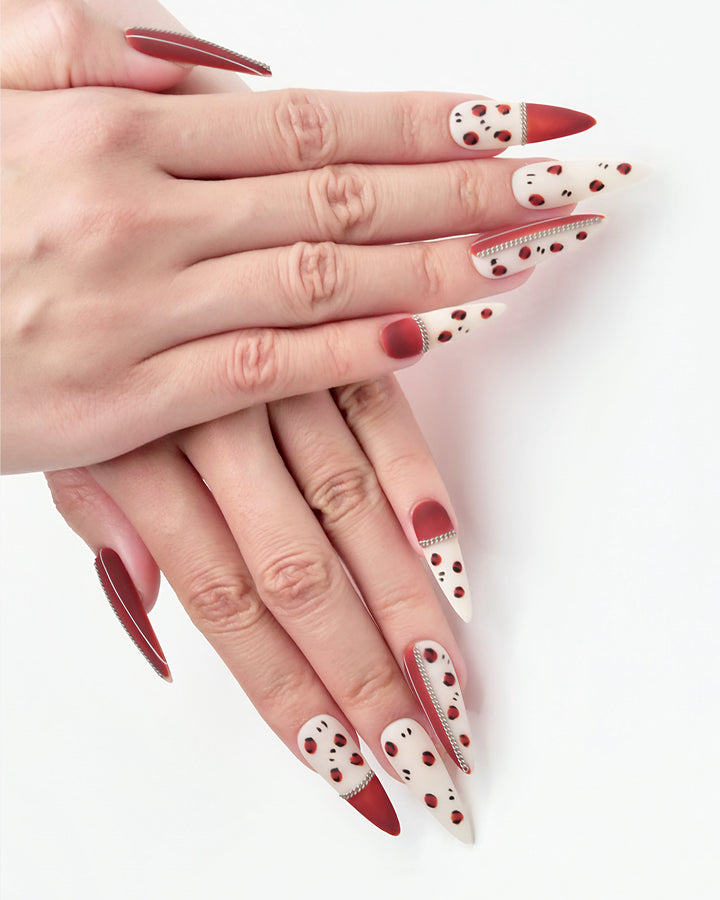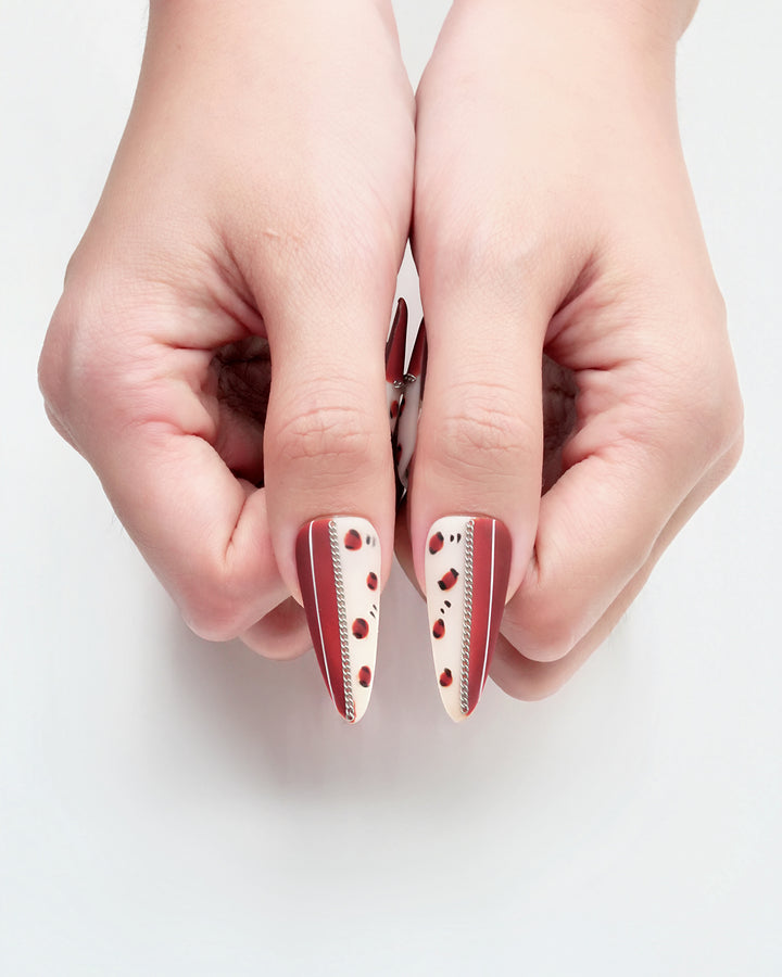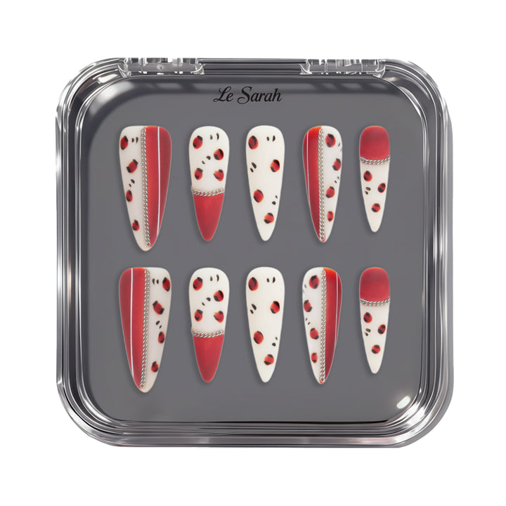 Le Sarah's Blossom Wine embodies the vibrant charm of blooming flowers. Part of our Natural Collection, this design features striking red-and-white color blocking, whimsical petal-inspired dot patterns, and elegant line accents. Evoking the freshness of a blossoming garden and the allure of nature's beauty, these nails add a lively, graceful touch to your look.