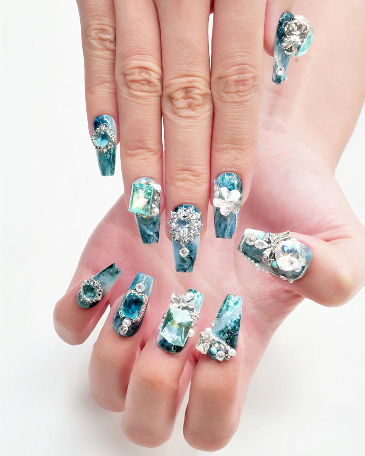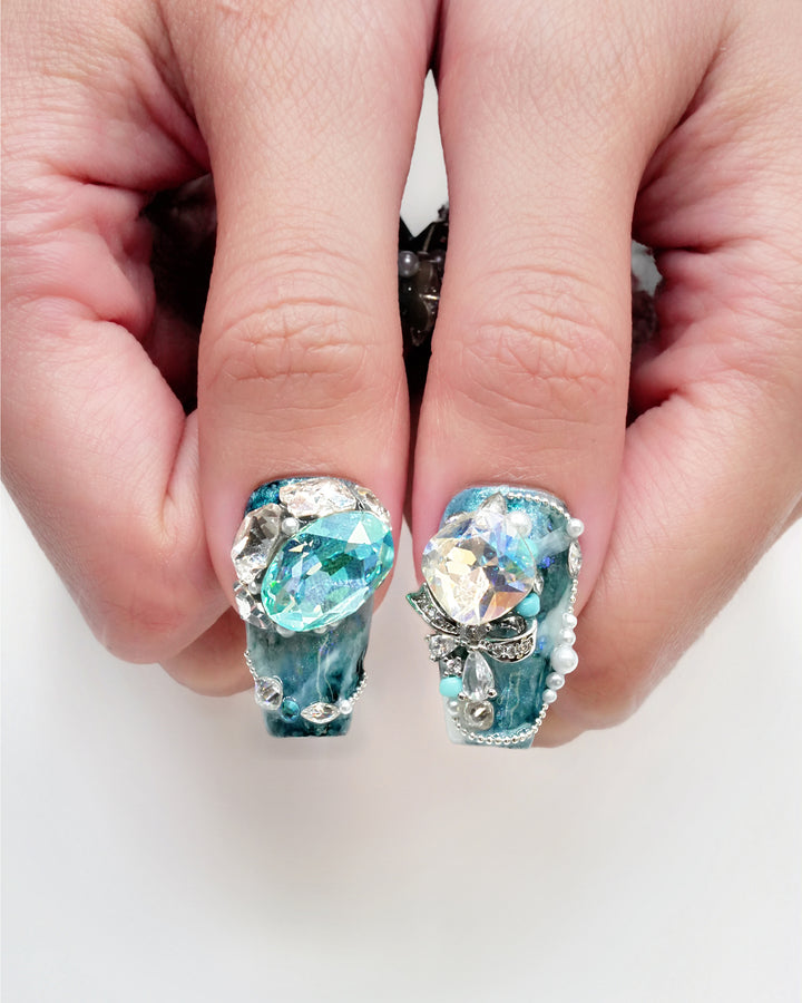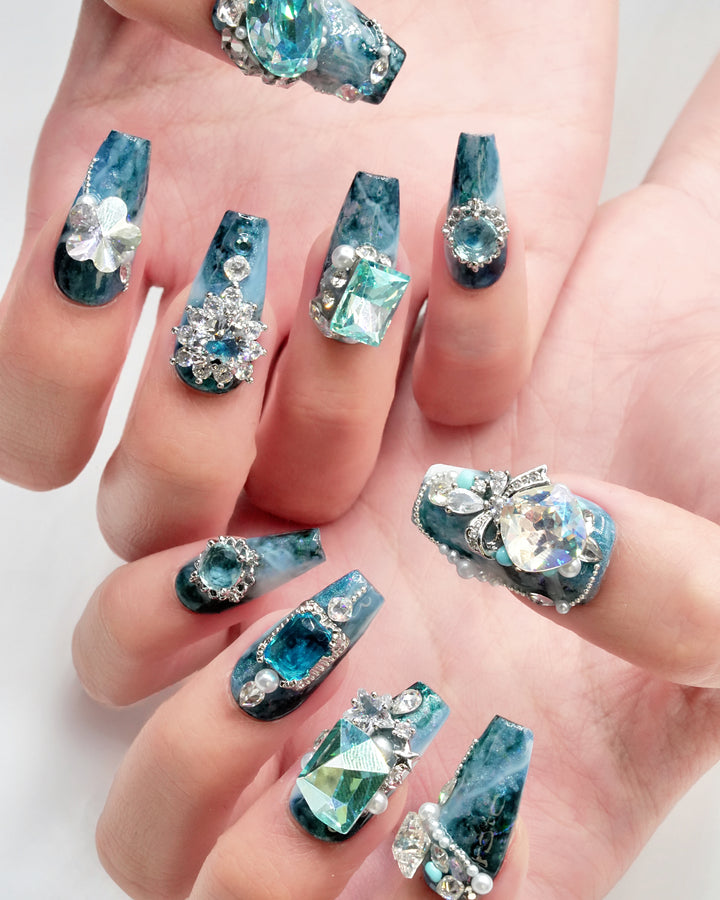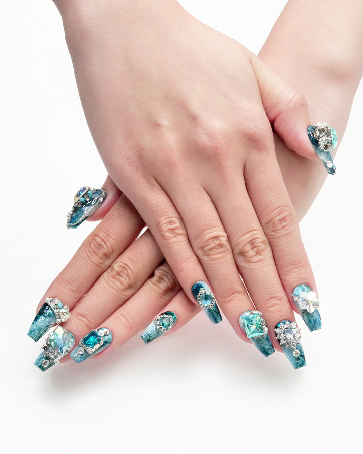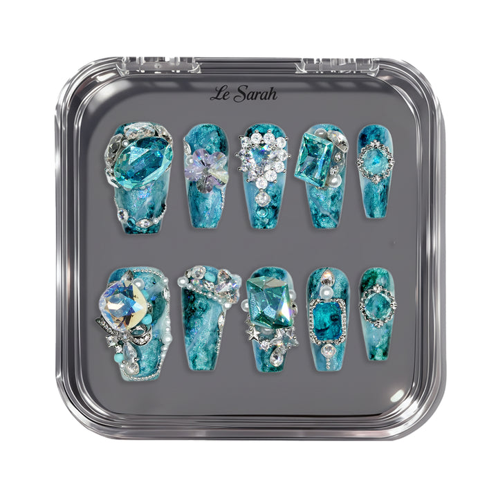 Le Sarah's Blue Tears from the Fine Jewelry collection is a mesmerizing blend of oceanic charm and luxurious detail. This design showcases a stunning gradient of ocean-blue hues, adorned with glistening crystal accents and intricate, gem-like embellishments that mimic the sparkle of sunlight on water. Evoking the mystical allure of teardrops falling into the sea, these nails bring an air of elegant serenity and captivating beauty to your look, perfect for those who desire a touch of aquatic-inspired glamour.