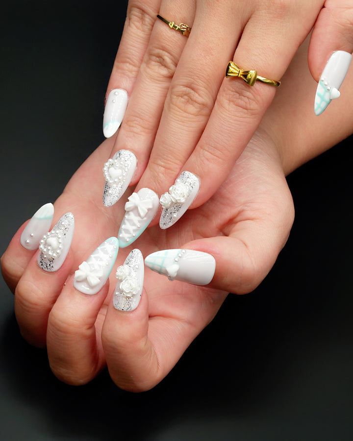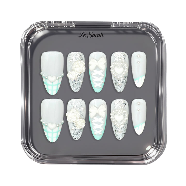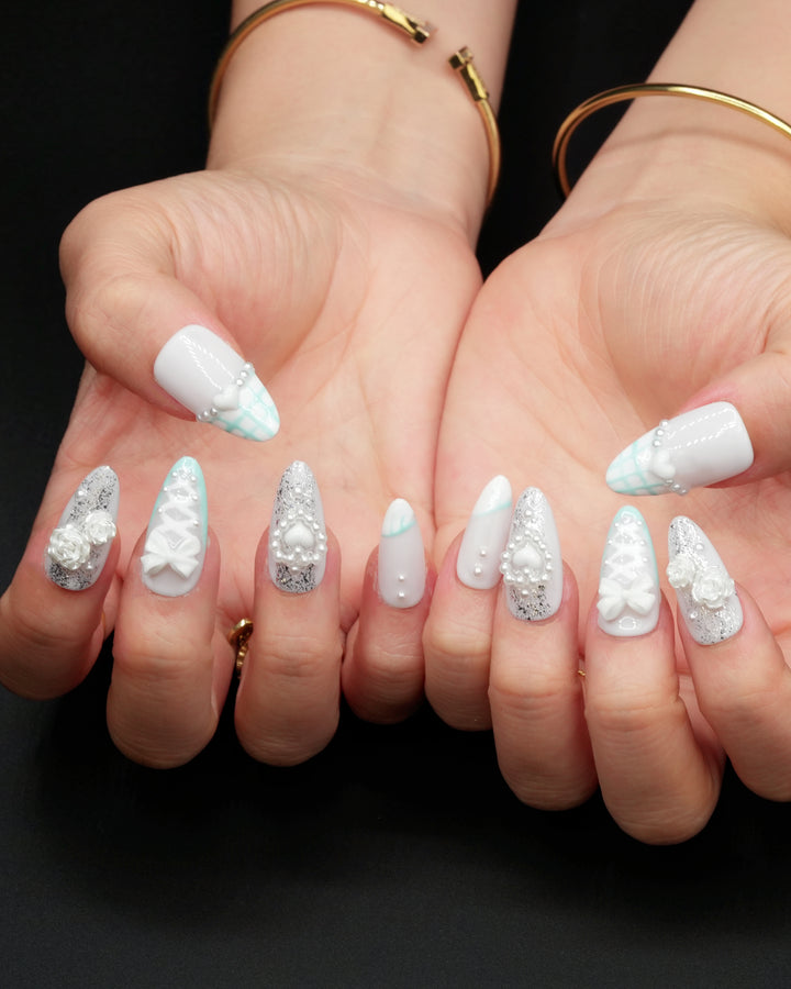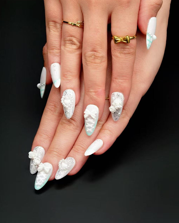 THESE ARE READY-TO-WEAR NAILS DESIGNED WITH RAISED TEXTURES AND SCULPTED ACCENTS THAT YOU CAN APPLY AT HOME. WITH PROPER PREP, A FULL SET CAN BE APPLIED IN ABOUT 10–15 MINUTES. THEY CAN STAY ON FOR UP TO THREE TO FOUR WEEKS WHEN USING NAIL GLUE, OR FOR SEVERAL DAYS WITH ADHESIVE TABS—PERFECT FOR SWITCHING STYLES WHENEVER YOU FEEL LIKE IT.