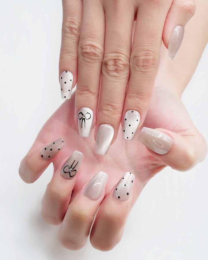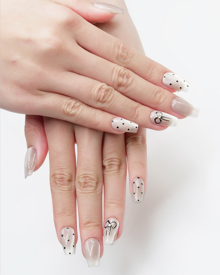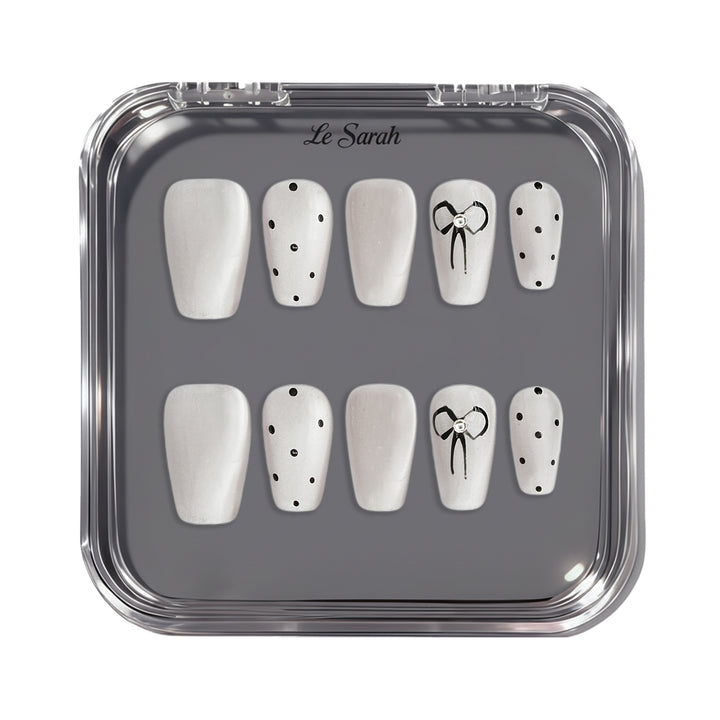 Le Sarah's Butterfly Polka reimagines workplace chic with playful refinement. Part of our Work Chic Collection, this design features a clean white base adorned with delicate black polka dots and charming bow details. Evoking the balance of professionalism and whimsical style, these nails bring a touch of polished, understated charm to your workday look—perfect for elevating office attire or adding a subtle creative flair to business meetings.