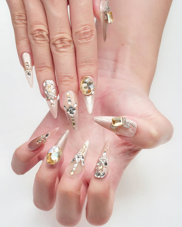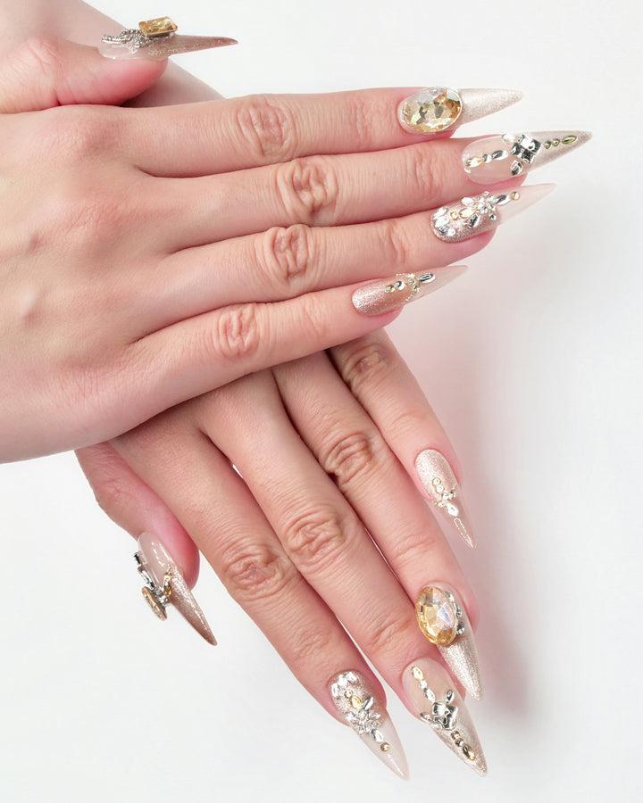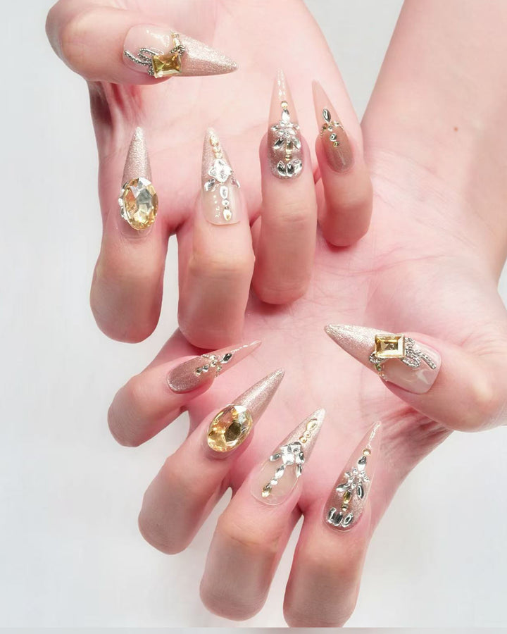 THESE ARE READY-TO-WEAR NAILS DESIGNED WITH RAISED TEXTURES AND SCULPTED ACCENTS THAT YOU CAN APPLY AT HOME. WITH PROPER PREP, A FULL SET CAN BE APPLIED IN ABOUT 10–15 MINUTES. THEY CAN STAY ON FOR UP TO THREE TO FOUR WEEKS WHEN USING NAIL GLUE, OR FOR SEVERAL DAYS WITH ADHESIVE TABS—PERFECT FOR SWITCHING STYLES WHENEVER YOU FEEL LIKE IT.