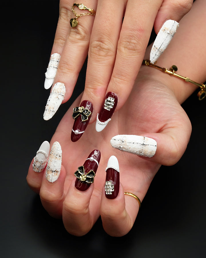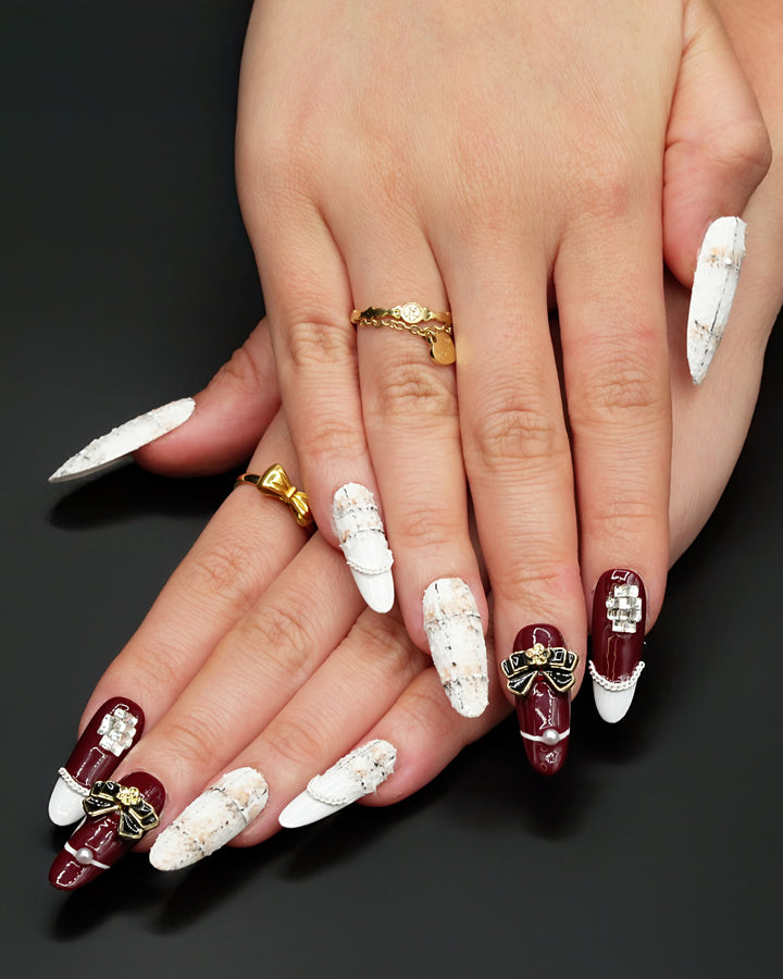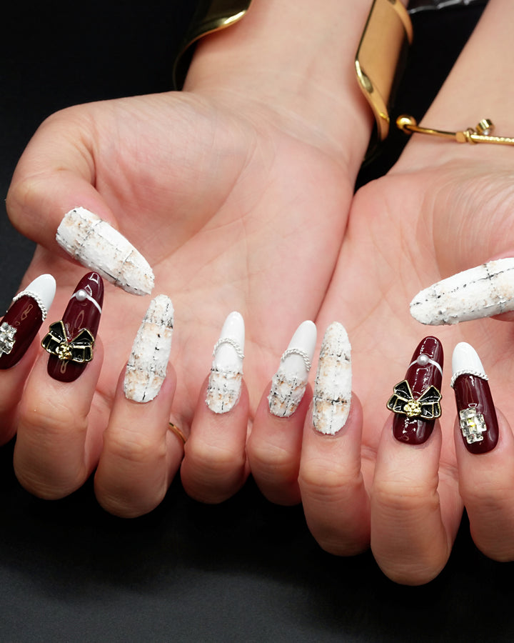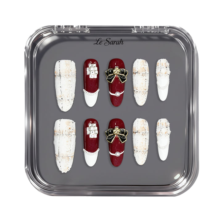 THESE ARE READY-TO-WEAR NAILS DESIGNED WITH RAISED TEXTURES AND SCULPTED ACCENTS THAT YOU CAN APPLY AT HOME. WITH PROPER PREP, A FULL SET CAN BE APPLIED IN ABOUT 10–15 MINUTES. THEY CAN STAY ON FOR UP TO THREE TO FOUR WEEKS WHEN USING NAIL GLUE, OR FOR SEVERAL DAYS WITH ADHESIVE TABS—PERFECT FOR SWITCHING STYLES WHENEVER YOU FEEL LIKE IT.
