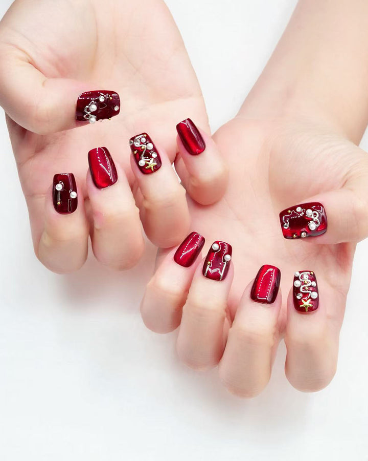 THESE ARE READY-TO-WEAR NAILS DESIGNED WITH RAISED TEXTURES AND SCULPTED ACCENTS THAT YOU CAN APPLY AT HOME. WITH PROPER PREP, A FULL SET CAN BE APPLIED IN ABOUT 10–15 MINUTES. THEY CAN STAY ON FOR UP TO THREE TO FOUR WEEKS WHEN USING NAIL GLUE, OR FOR SEVERAL DAYS WITH ADHESIVE TABS—PERFECT FOR SWITCHING STYLES WHENEVER YOU FEEL LIKE IT.