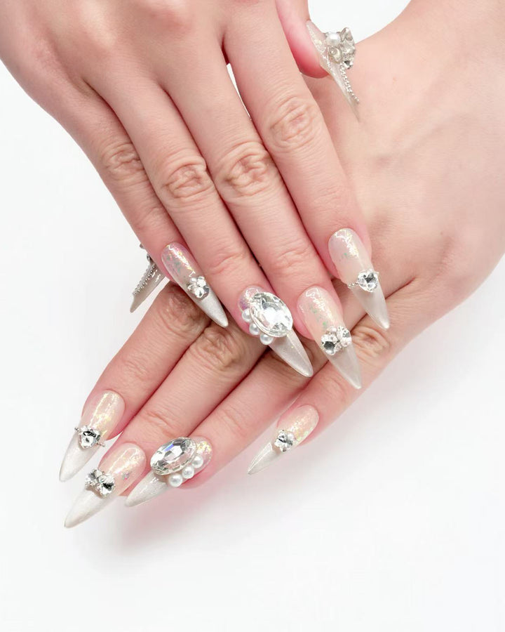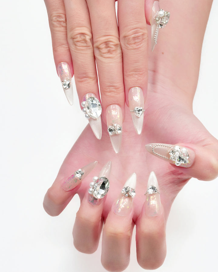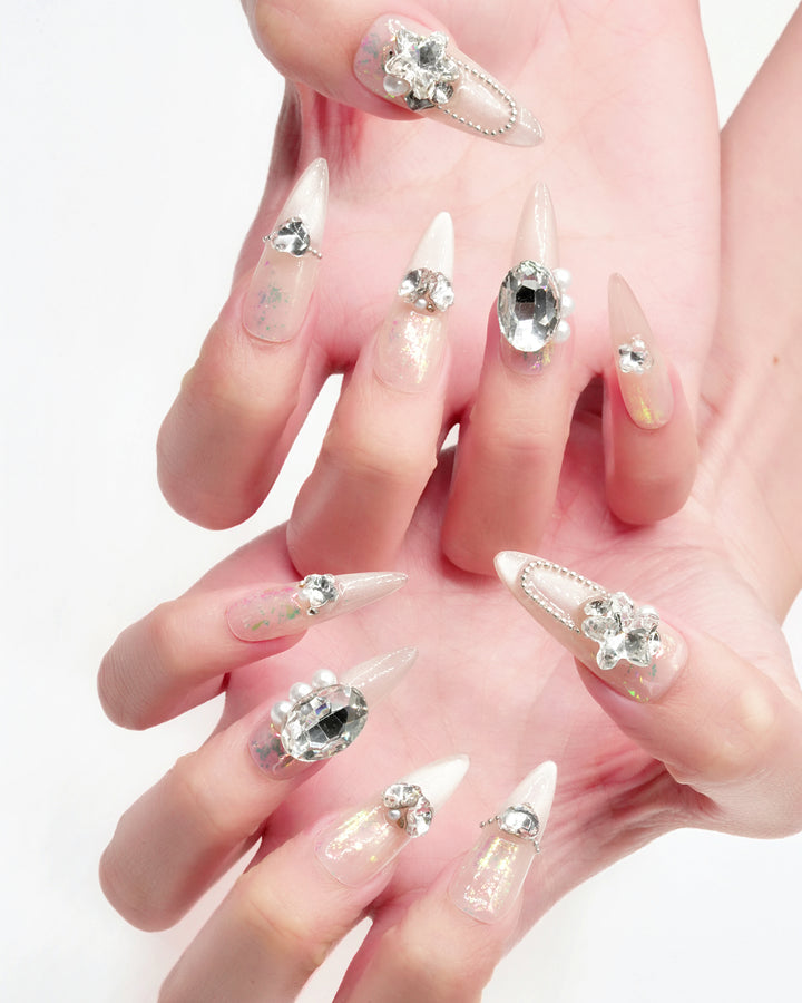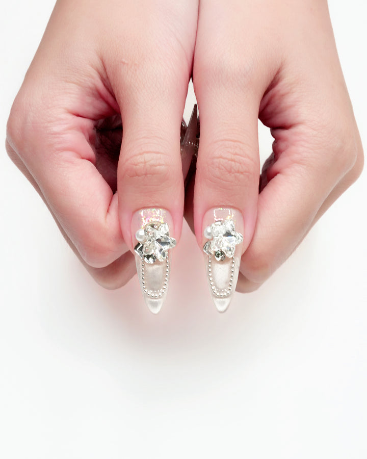 THESE ARE READY-TO-WEAR NAILS DESIGNED WITH RAISED TEXTURES AND SCULPTED ACCENTS THAT YOU CAN APPLY AT HOME. WITH PROPER PREP, A FULL SET CAN BE APPLIED IN ABOUT 10–15 MINUTES. THEY CAN STAY ON FOR UP TO THREE TO FOUR WEEKS WHEN USING NAIL GLUE, OR FOR SEVERAL DAYS WITH ADHESIVE TABS—PERFECT FOR SWITCHING STYLES WHENEVER YOU FEEL LIKE IT.