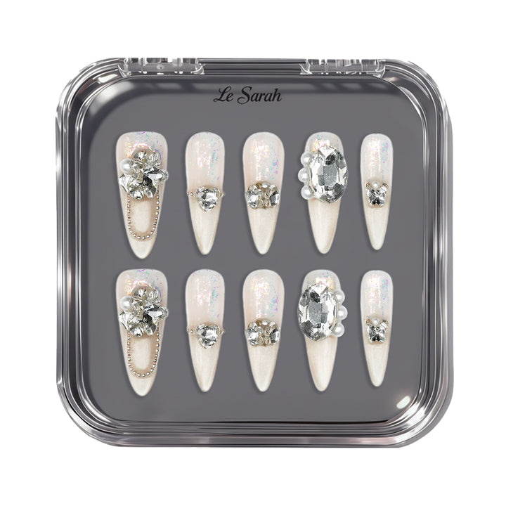 Le Sarah's Crystal Elegance from the Fairytale series showcases dazzling crystal embellishments, iridescent accents, and a soft ivory base, creating a glamorous, regal look that sparkles like a fairytale gem.