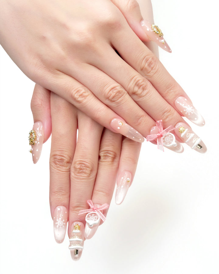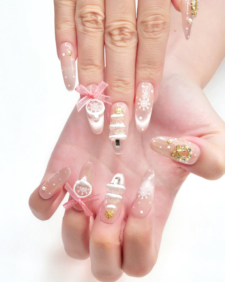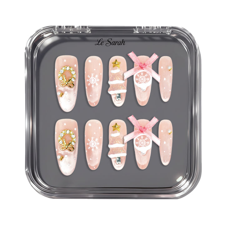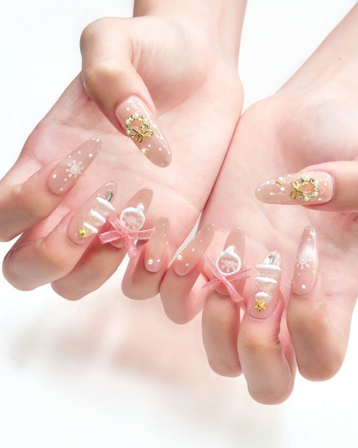 Le Sarah's Crystal Snow Globe from the Christmas series features delicate snowflake details, shimmering crystal accents, and a soft nude base, creating a dreamy, elegant look that feels like a miniature snow globe on your nails.
