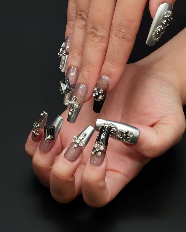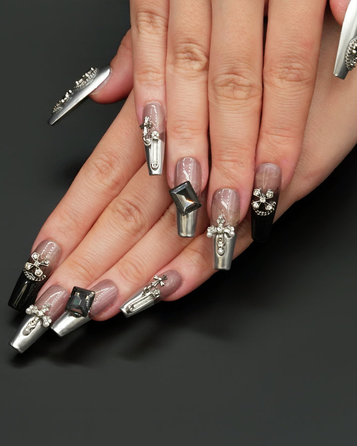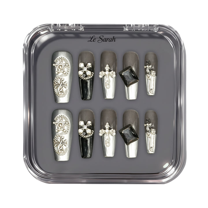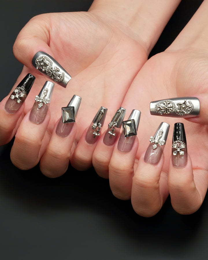 Le Sarah's Dark Matter Fade, a standout in our SCI-FI Collection, plunges you into a futuristic realm. This design showcases a sleek dark matter gradient, interspersed with edgy metallic silver and black accents, plus avant-garde geometric and emblem details. Capturing the mystery of cosmic darkness and the innovation of sci-fi tech, these nails bring a bold, futuristic edge to your look, whether you're stepping into a cyber-themed event or just embracing experimental style.