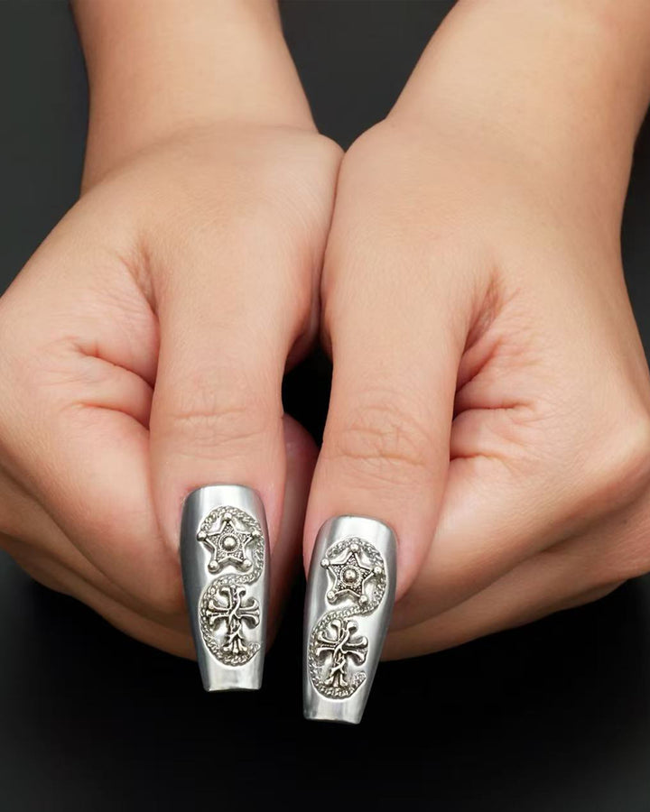 THESE ARE READY-TO-WEAR NAILS DESIGNED WITH RAISED TEXTURES AND SCULPTED ACCENTS THAT YOU CAN APPLY AT HOME. WITH PROPER PREP, A FULL SET CAN BE APPLIED IN ABOUT 10–15 MINUTES. THEY CAN STAY ON FOR UP TO THREE TO FOUR WEEKS WHEN USING NAIL GLUE, OR FOR SEVERAL DAYS WITH ADHESIVE TABS—PERFECT FOR SWITCHING STYLES WHENEVER YOU FEEL LIKE IT.