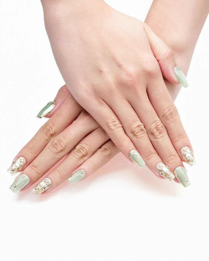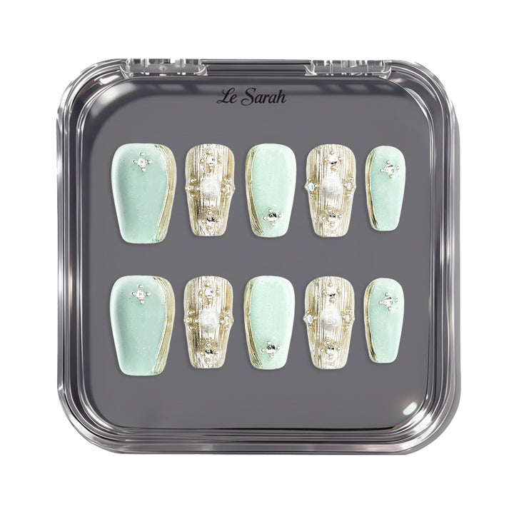 Le Sarah's Enchanted Buccellati from the Fairytale series blends soft mint hues, intricate metallic details, and delicate crystal accents, creating an enchanted, luxurious look inspired by fairytale elegance.