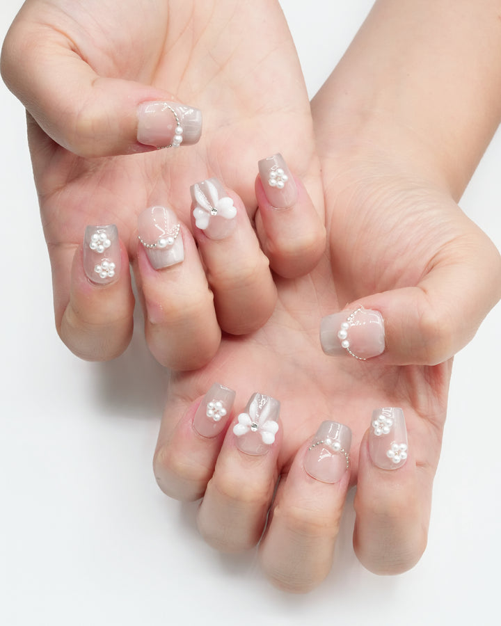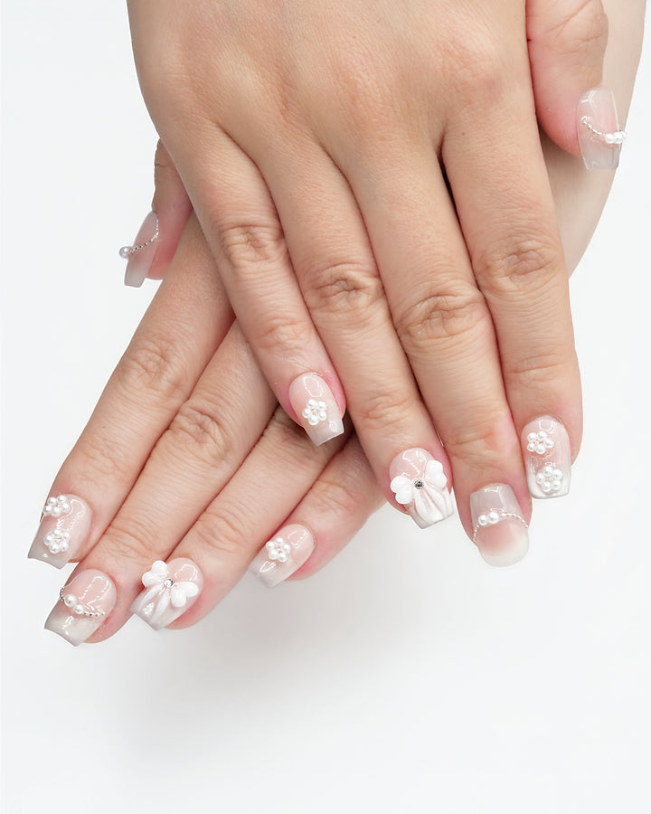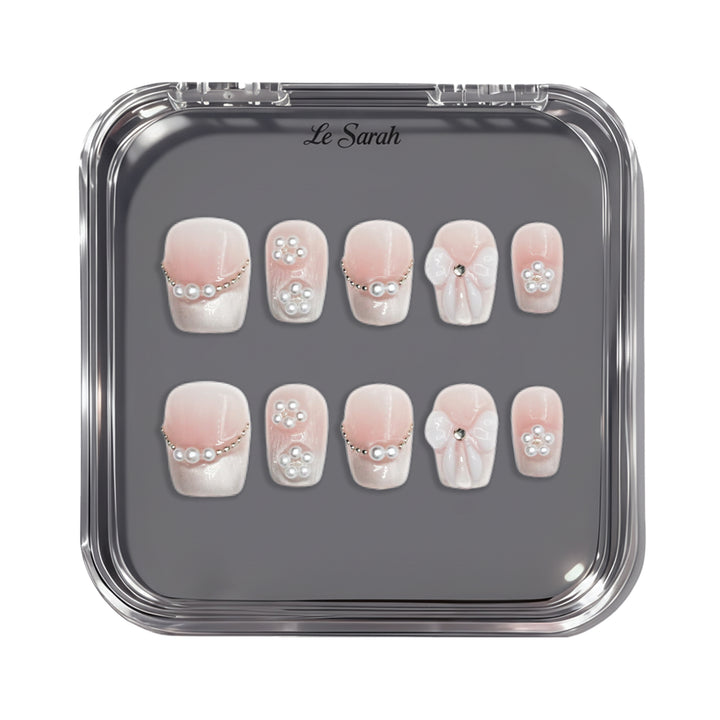 Le Sarah's Frosted Butterfly balances workplace polish with whimsical charm. Part of our Work Chic Collection, this design features soft pink-and-white gradient bases adorned with delicate pearl accents and dainty butterfly-inspired details. Evoking the grace of a modern professional who embraces subtle romance, these nails bring a touch of refined, dreamy elegance to your workday look—perfect for adding a polished yet playful finish to office attire or client meetings.