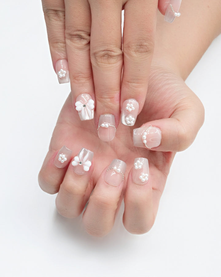 THESE ARE READY-TO-WEAR NAILS DESIGNED WITH RAISED TEXTURES AND SCULPTED ACCENTS THAT YOU CAN APPLY AT HOME. WITH PROPER PREP, A FULL SET CAN BE APPLIED IN ABOUT 10–15 MINUTES. THEY CAN STAY ON FOR UP TO THREE TO FOUR WEEKS WHEN USING NAIL GLUE, OR FOR SEVERAL DAYS WITH ADHESIVE TABS—PERFECT FOR SWITCHING STYLES WHENEVER YOU FEEL LIKE IT.