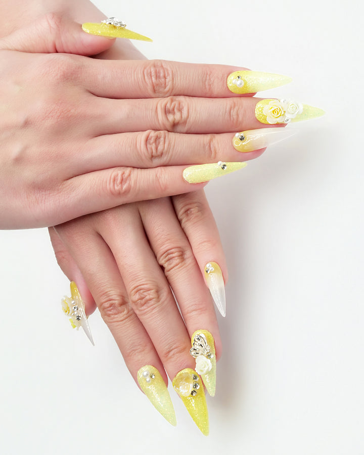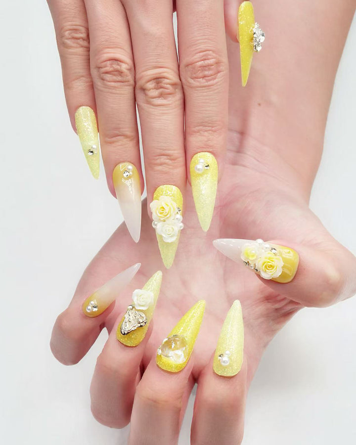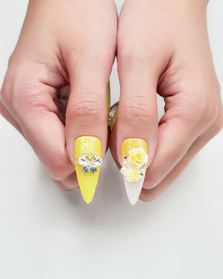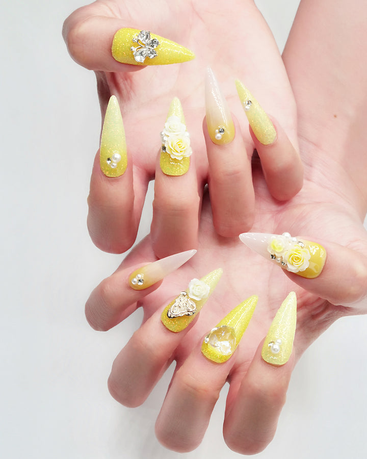 Le Sarah's Golden Summer from the Floral series showcases sunny yellow hues with elegant 3D rose blooms and sparkling accents, capturing the vibrant, blooming energy of summer in a glamorous, eye-catching design.