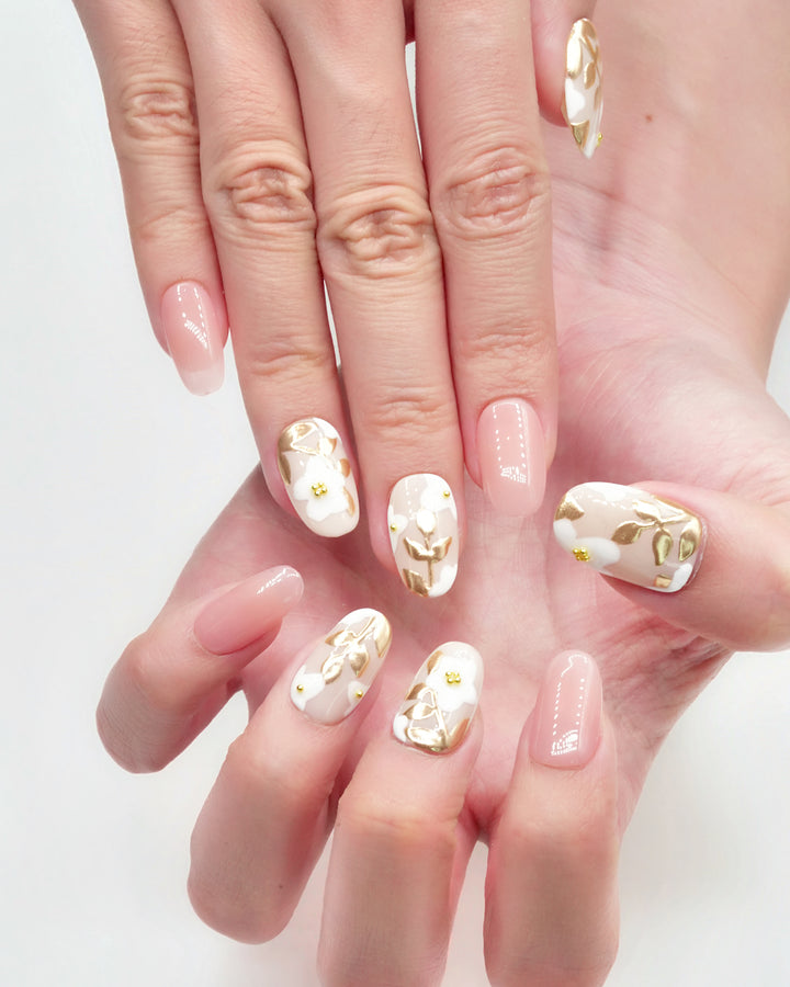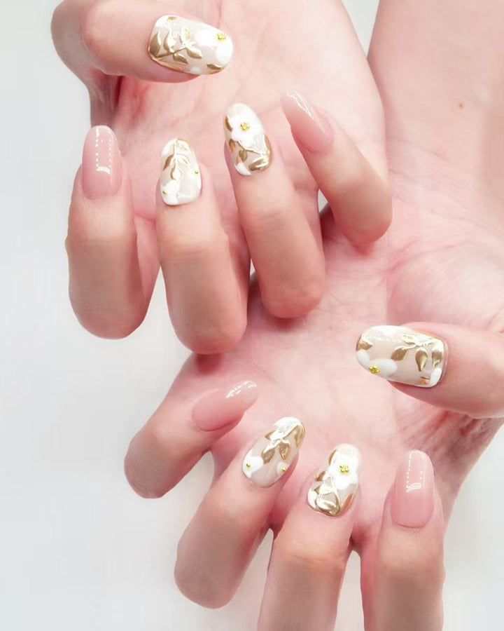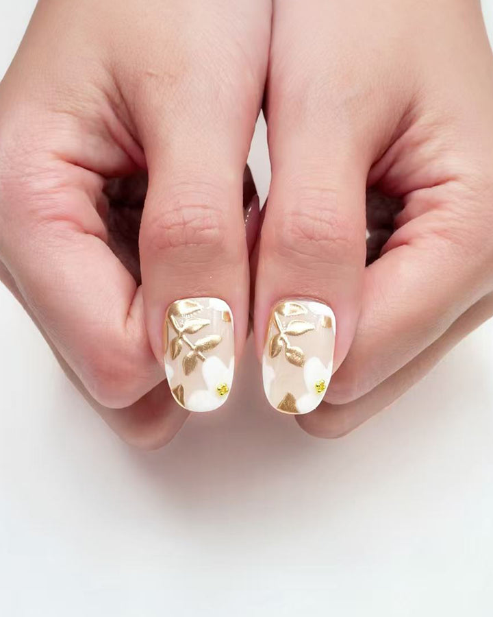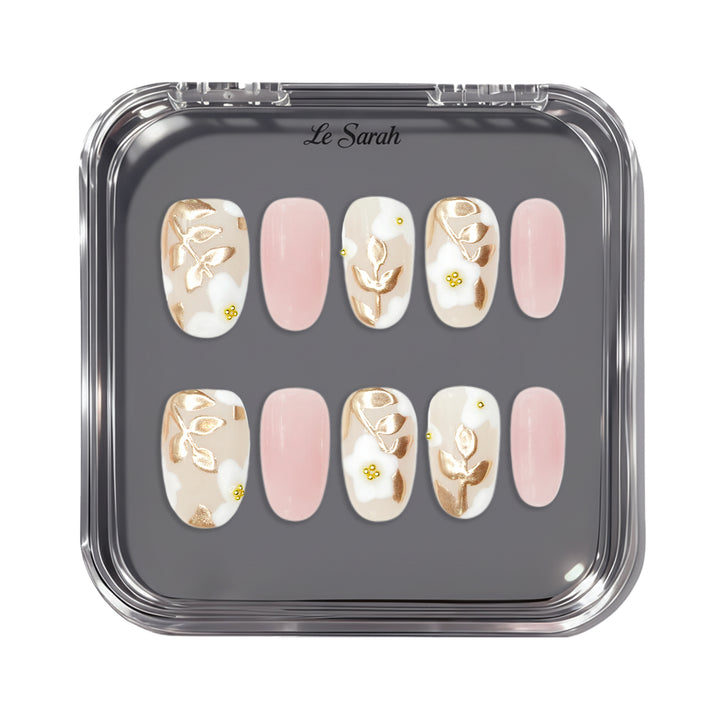 Le Sarah's Golden Vine Spell from the Floral series showcases elegant gold vine motifs on soft neutral bases, paired with delicate accents, creating a luxurious, nature-inspired look perfect for sophisticated style.
