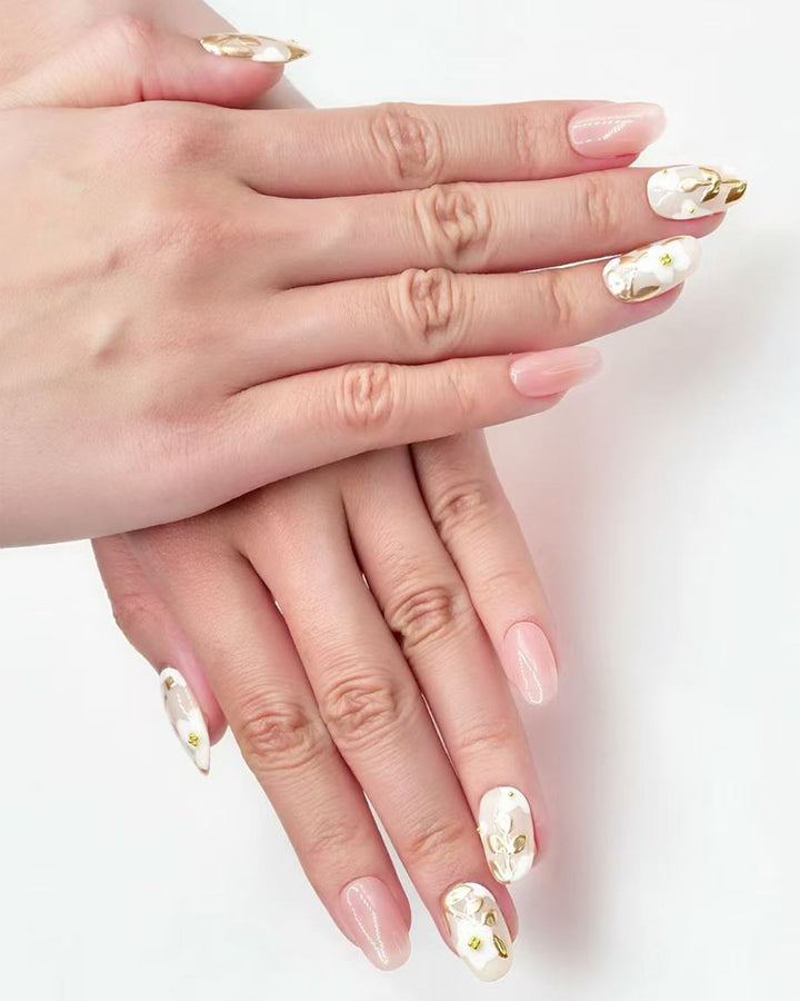 THESE ARE READY-TO-WEAR NAILS DESIGNED WITH RAISED TEXTURES AND SCULPTED ACCENTS THAT YOU CAN APPLY AT HOME. WITH PROPER PREP, A FULL SET CAN BE APPLIED IN ABOUT 10–15 MINUTES. THEY CAN STAY ON FOR UP TO THREE TO FOUR WEEKS WHEN USING NAIL GLUE, OR FOR SEVERAL DAYS WITH ADHESIVE TABS—PERFECT FOR SWITCHING STYLES WHENEVER YOU FEEL LIKE IT.