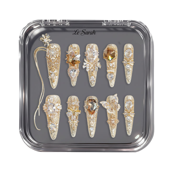 Le Sarah's 'Golden Waltz' embodies the luxury of fine jewelry for your fingertips. Part of our 'Fine Jewelry Collection', this design showcases intricate golden accents and delicate metallic details, inspired by the elegance of a gala soirée. Each piece reflects a perfect balance of opulence and sophistication, making it an exquisite accessory for any occasion.