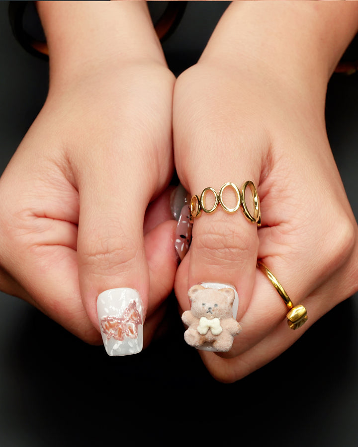 THESE ARE READY-TO-WEAR NAILS DESIGNED WITH RAISED TEXTURES AND SCULPTED ACCENTS THAT YOU CAN APPLY AT HOME. WITH PROPER PREP, A FULL SET CAN BE APPLIED IN ABOUT 10–15 MINUTES. THEY CAN STAY ON FOR UP TO THREE TO FOUR WEEKS WHEN USING NAIL GLUE, OR FOR SEVERAL DAYS WITH ADHESIVE TABS—PERFECT FOR SWITCHING STYLES WHENEVER YOU FEEL LIKE IT.