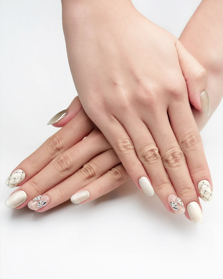 THESE ARE READY-TO-WEAR NAILS DESIGNED WITH RAISED TEXTURES AND SCULPTED ACCENTS THAT YOU CAN APPLY AT HOME. WITH PROPER PREP, A FULL SET CAN BE APPLIED IN ABOUT 10–15 MINUTES. THEY CAN STAY ON FOR UP TO THREE TO FOUR WEEKS WHEN USING NAIL GLUE, OR FOR SEVERAL DAYS WITH ADHESIVE TABS—PERFECT FOR SWITCHING STYLES WHENEVER YOU FEEL LIKE IT.