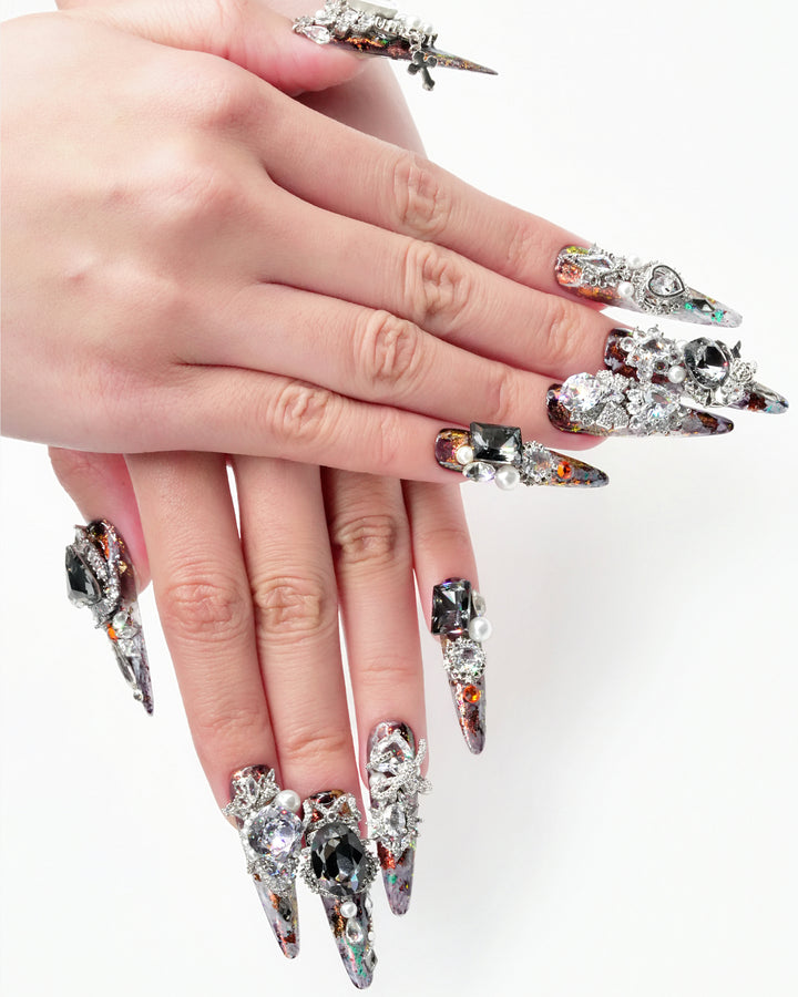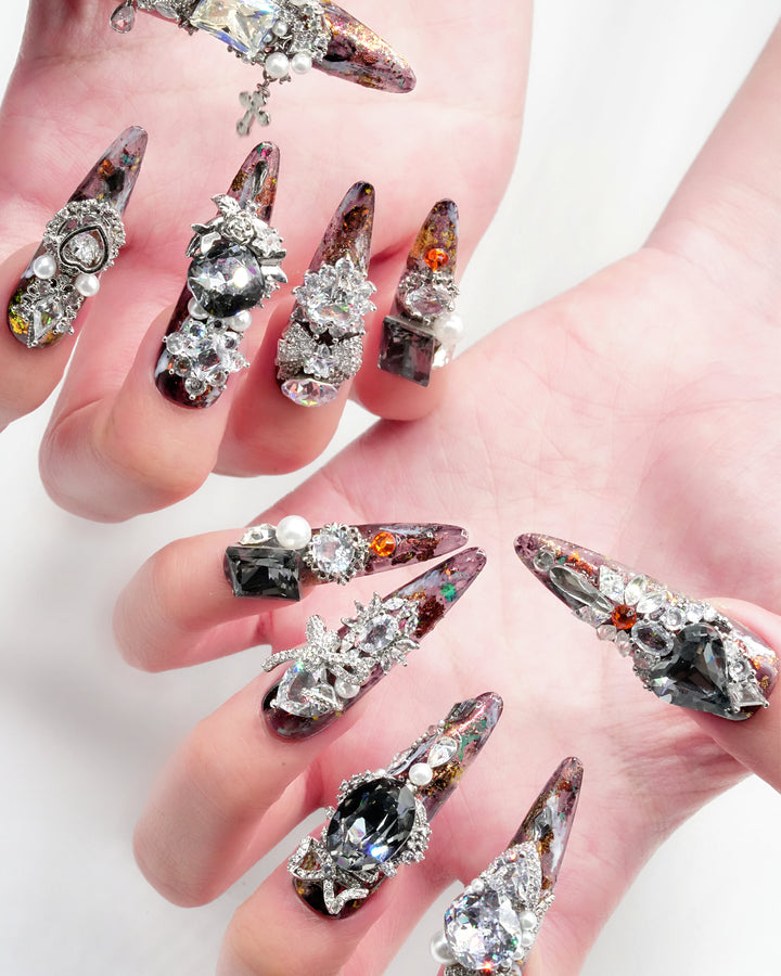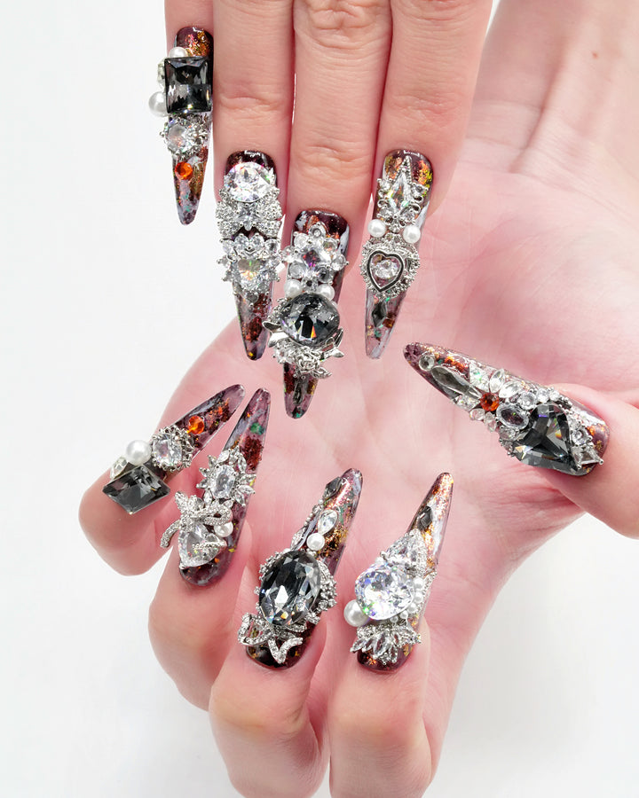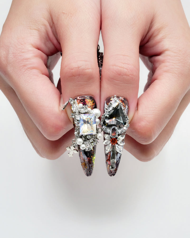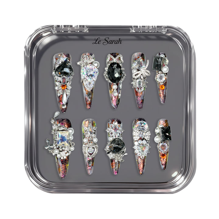 Le Sarah's Lonely Night from the Fine Jewelry collection is a captivating fusion of dark allure and intricate artistry. This design showcases a rich, multi-hued base with hints of deep tones, adorned with elaborate crystal clusters, bold gem-like embellishments, and delicate, almost ethereal decorative elements. Evoking the mysterious ambiance of a quiet, starry night, these nails bring an air of dramatic sophistication and unique charm to your style, perfect for making a bold and unforgettable fashion statement.