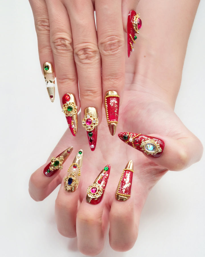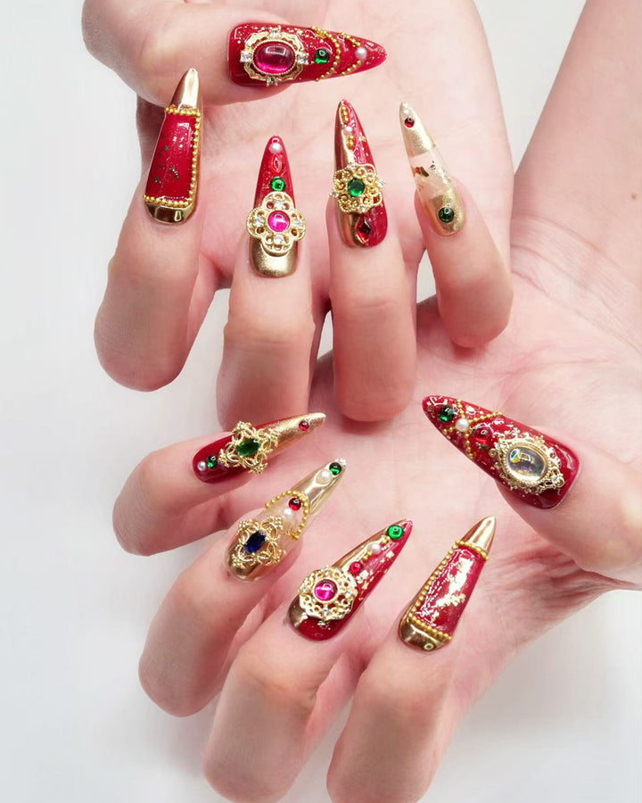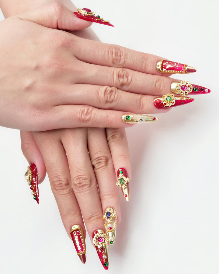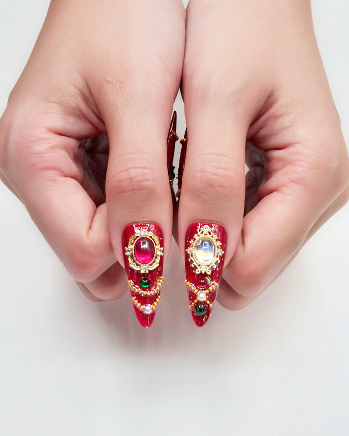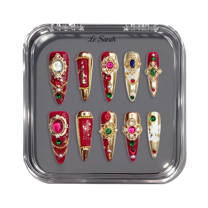 Le Sarah's Lover’s Vow, a stunning piece from our Night Out Collection, fuses opulent romance with vintage-inspired glamour. This design features a rich red base, adorned with multi-colored gemstones, intricate gold filigree, and regal motifs that evoke the grandeur of a ceremonial night. Capturing the essence of passionate commitment, these nails bring a luxurious, head-turning charm to your evening style, ideal for making a bold statement at formal events or romantic nights out.