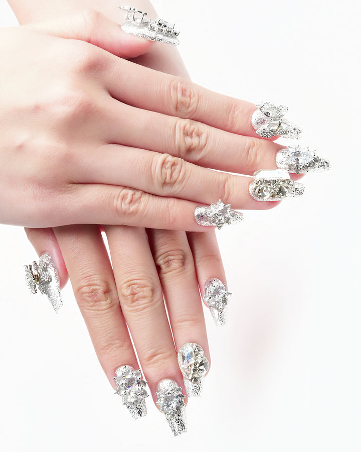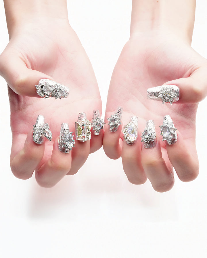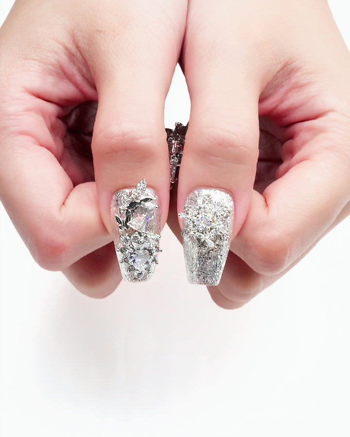 THESE ARE READY-TO-WEAR NAILS DESIGNED WITH RAISED TEXTURES AND SCULPTED ACCENTS THAT YOU CAN APPLY AT HOME. WITH PROPER PREP, A FULL SET CAN BE APPLIED IN ABOUT 10–15 MINUTES. THEY CAN STAY ON FOR UP TO THREE TO FOUR WEEKS WHEN USING NAIL GLUE, OR FOR SEVERAL DAYS WITH ADHESIVE TABS—PERFECT FOR SWITCHING STYLES WHENEVER YOU FEEL LIKE IT.