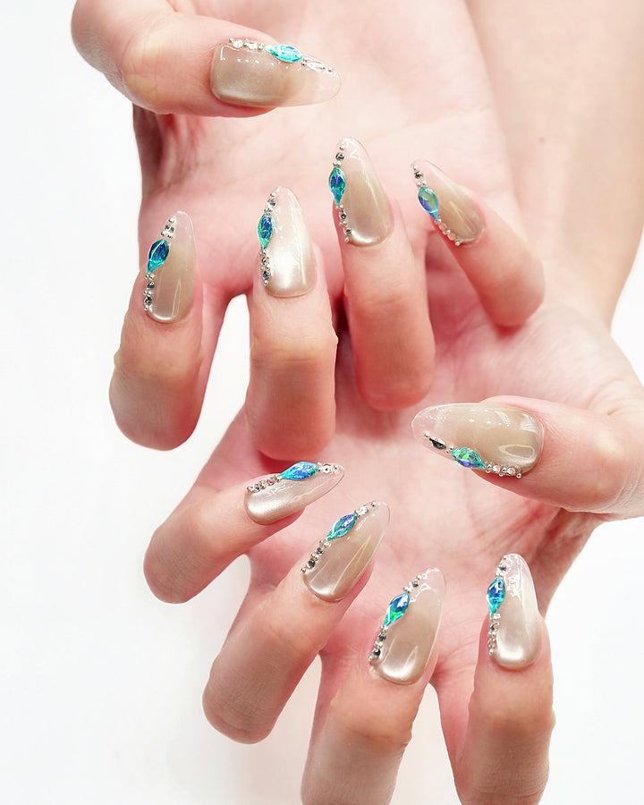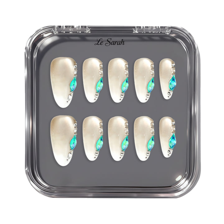 Le Sarah's Mermaid's Tear from the Classic series features iridescent hues, delicate blue gem accents, and a shimmering finish, creating a whimsical, ocean-inspired look reminiscent of a mermaid's treasures.