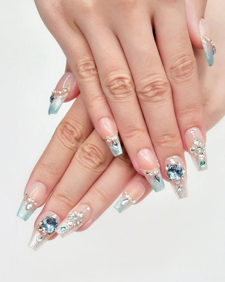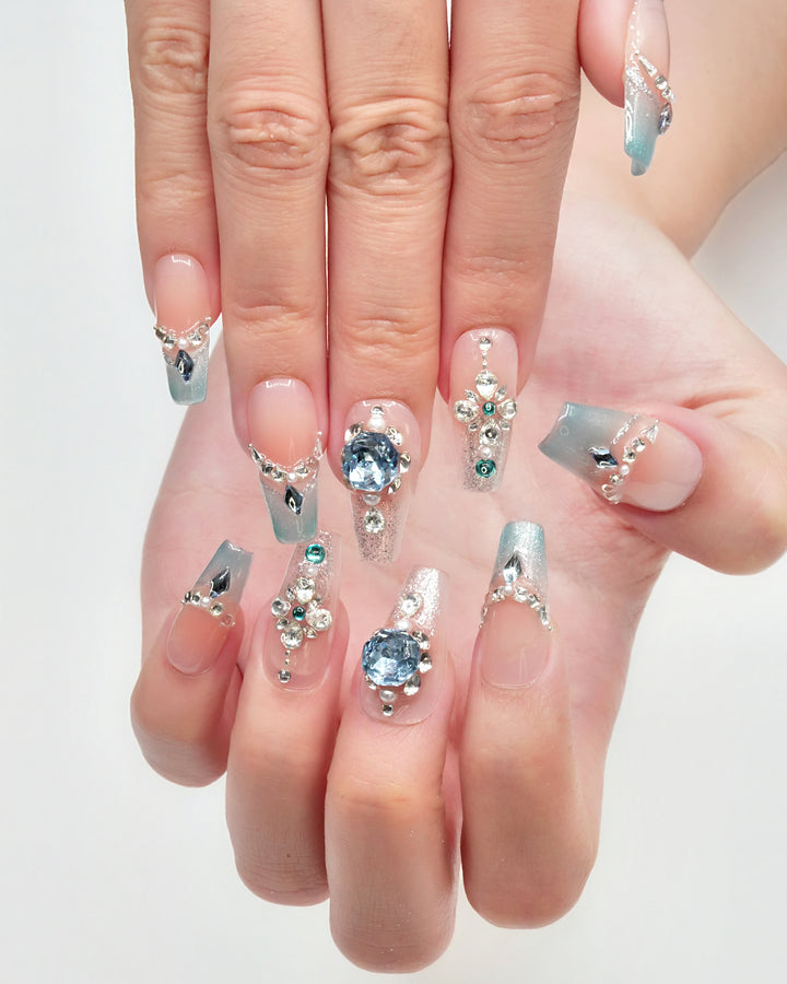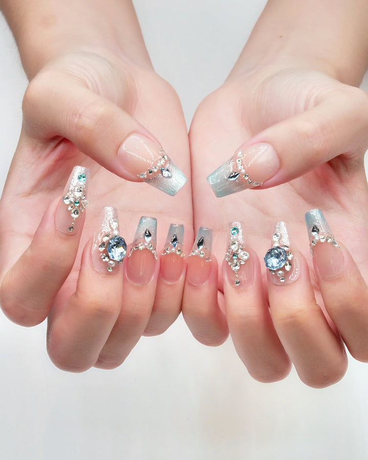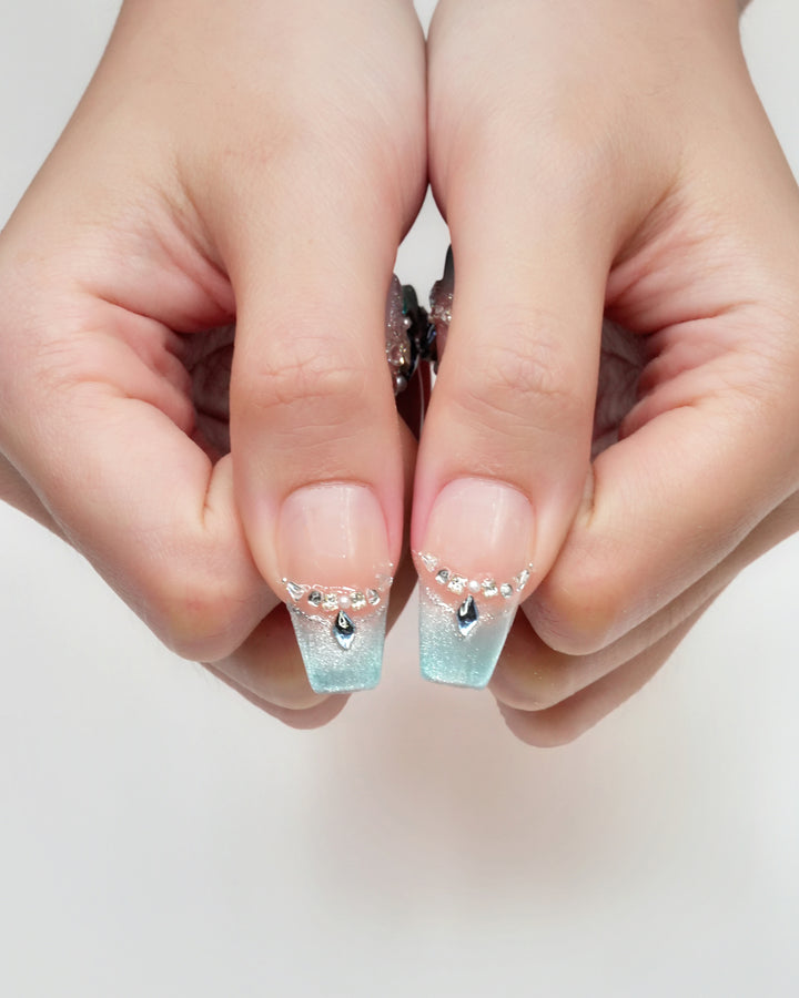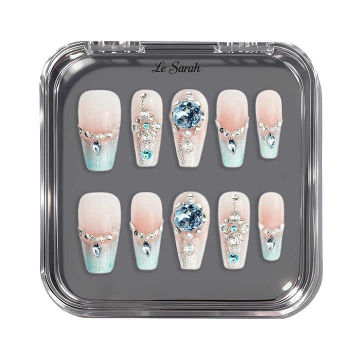 Le Sarah's Midnight Sapphire, a dazzling piece from our Elevated French Collection, fuses cool-toned elegance with luxurious sparkle. This design features soft pink-to-azure gradient bases adorned with luminous sapphire-inspired gem details and intricate crystal embellishments, evoking the allure of a starry night. Capturing the essence of refined glamour, these nails bring a sophisticated, eye-catching charm to any ensemble, perfect for those who love to make a bold yet polished statement.