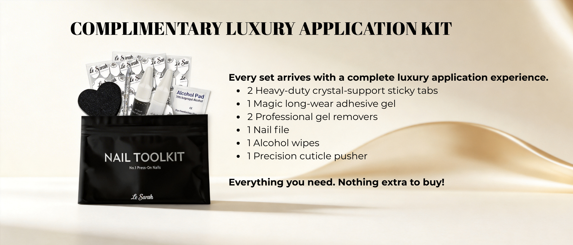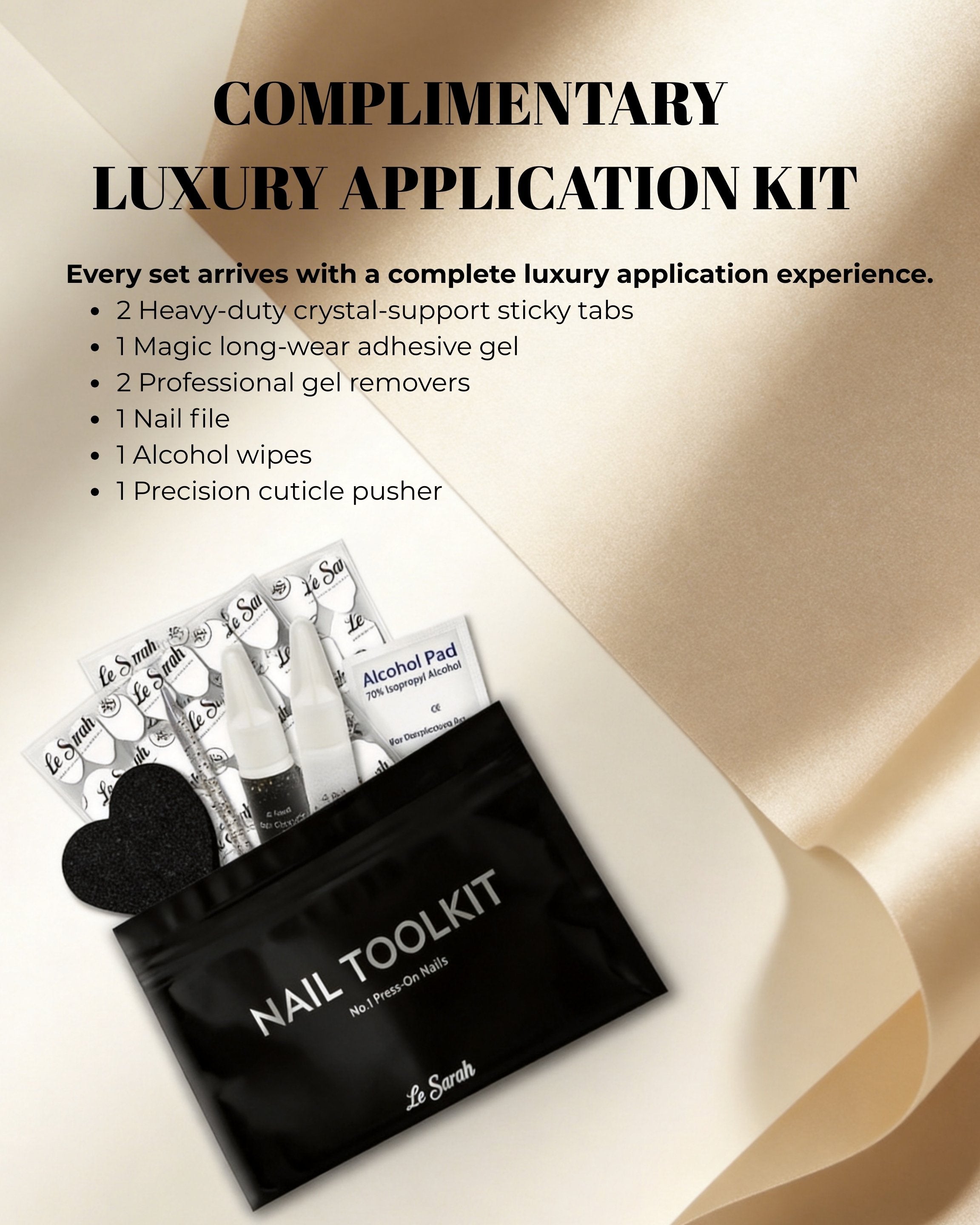 2 custom-developed strong sticky tab sheets, 1 magic glue, 1 gel remover, nail file, alcohol wipe, and cuticle pusher.
