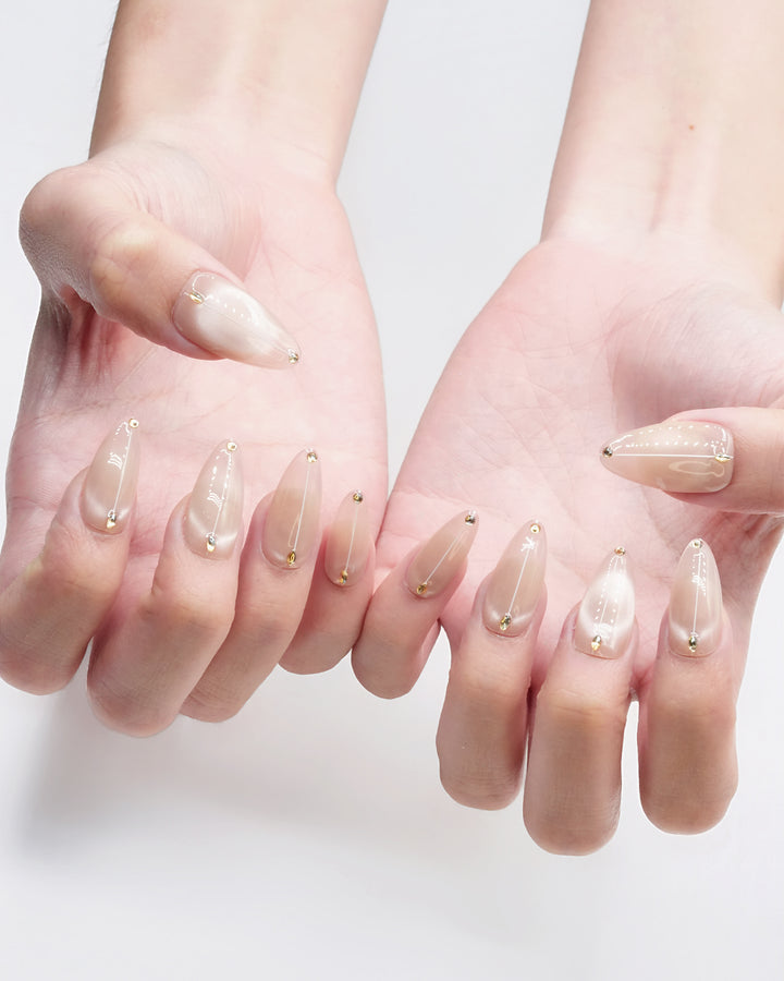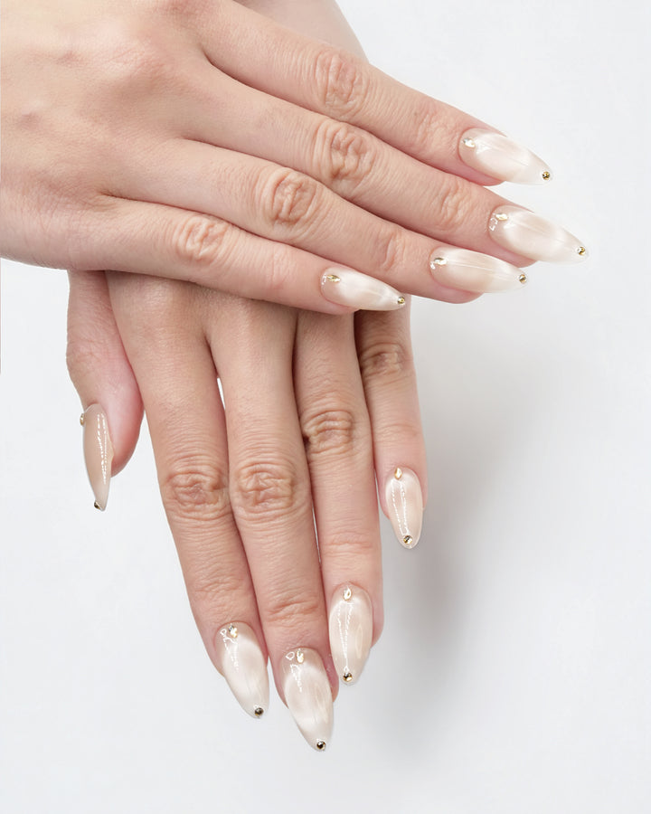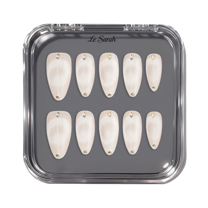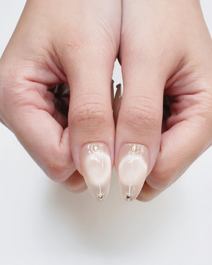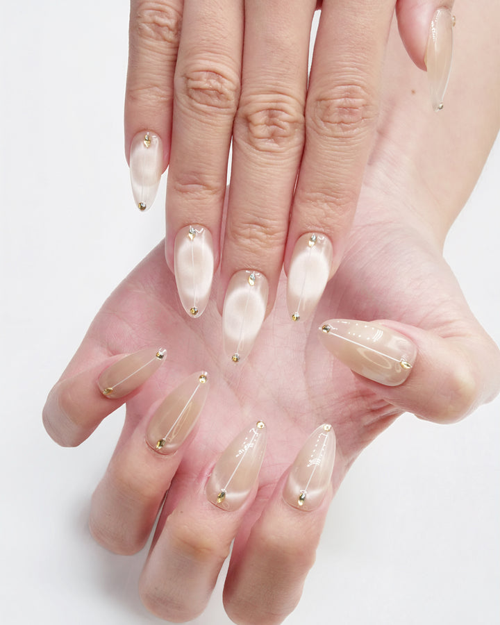 Le Sarah's Midnight Sun Cat-Eye illuminates workplace sophistication with warm, celestial charm. Part of our Work Chic Collection, this design features a soft champagne-hued base enhanced by mesmerizing cat-eye magnetic patterns and delicate metallic accents, evoking the gentle glow of the midnight sun. Balancing professional poise with understated luxury, these nails bring a touch of refined, luminous elegance to your workday look—perfect for elevating boardroom meetings or adding a polished finish to everyday office attire.