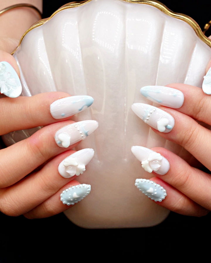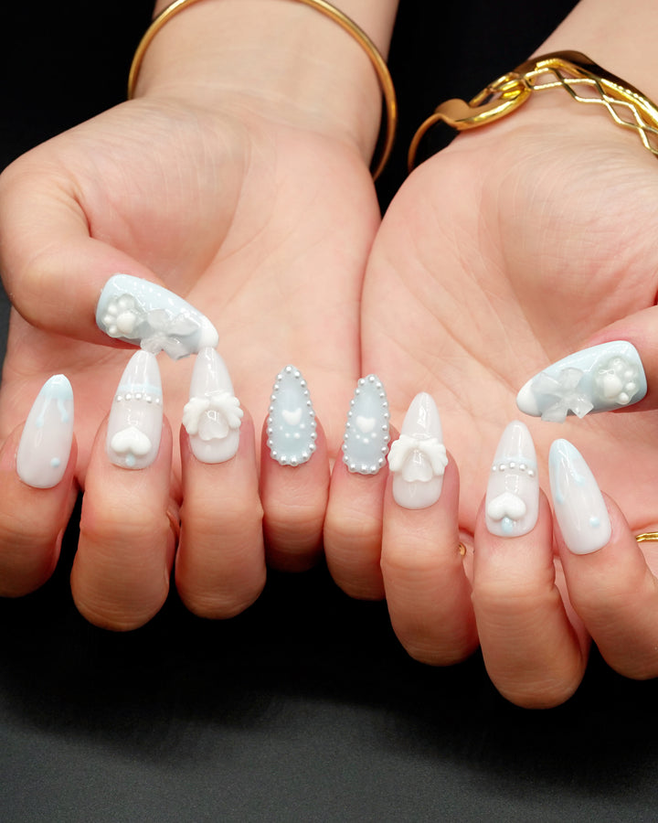 THESE ARE READY-TO-WEAR NAILS DESIGNED WITH RAISED TEXTURES AND SCULPTED ACCENTS THAT YOU CAN APPLY AT HOME. WITH PROPER PREP, A FULL SET CAN BE APPLIED IN ABOUT 10–15 MINUTES. THEY CAN STAY ON FOR UP TO THREE TO FOUR WEEKS WHEN USING NAIL GLUE, OR FOR SEVERAL DAYS WITH ADHESIVE TABS—PERFECT FOR SWITCHING STYLES WHENEVER YOU FEEL LIKE IT.