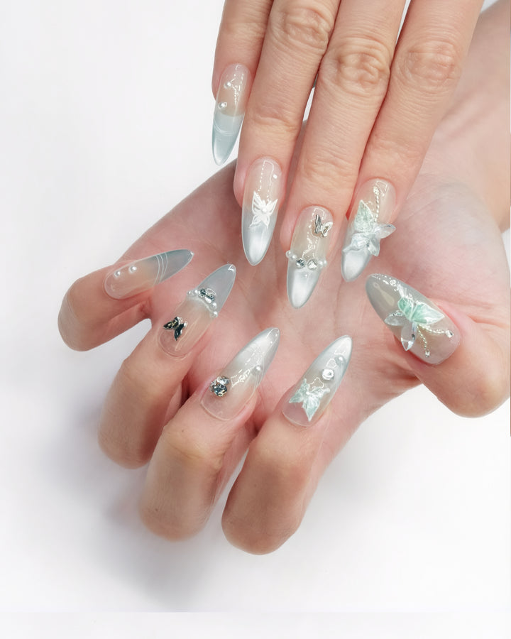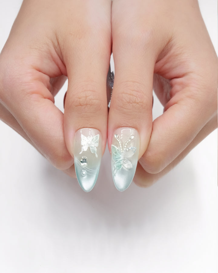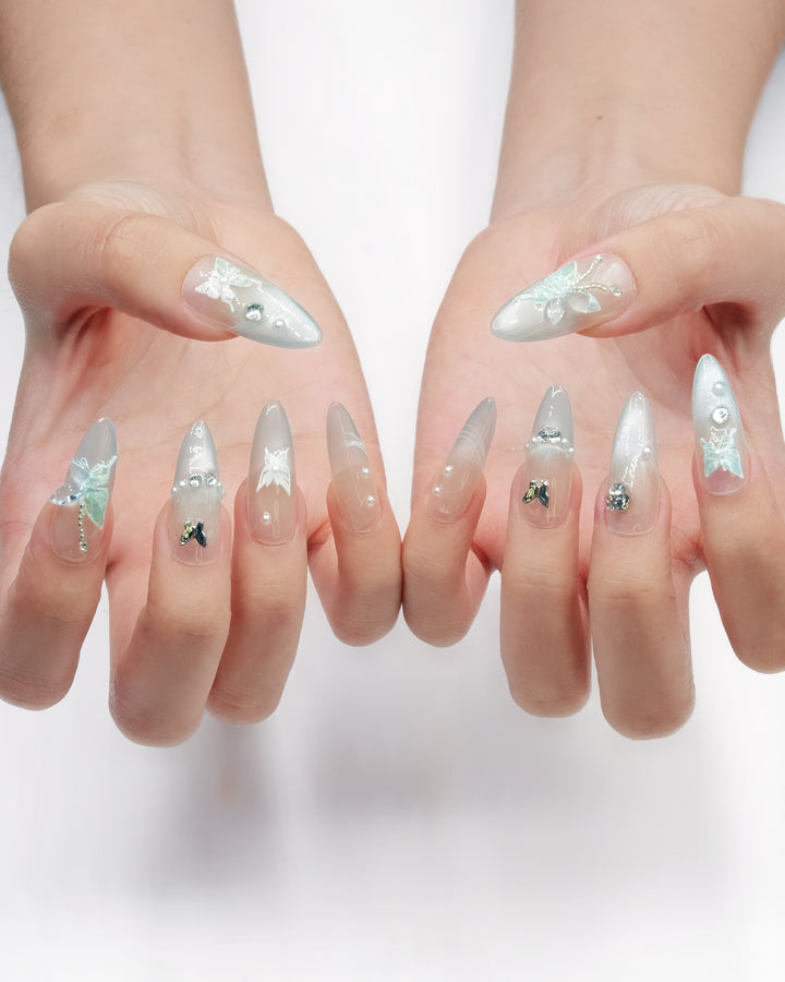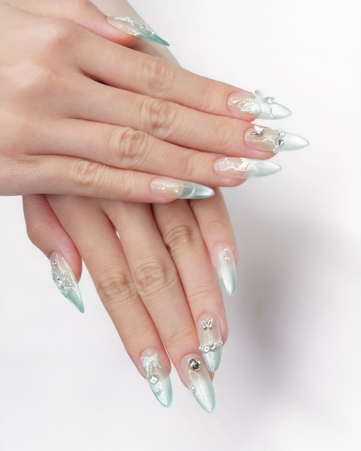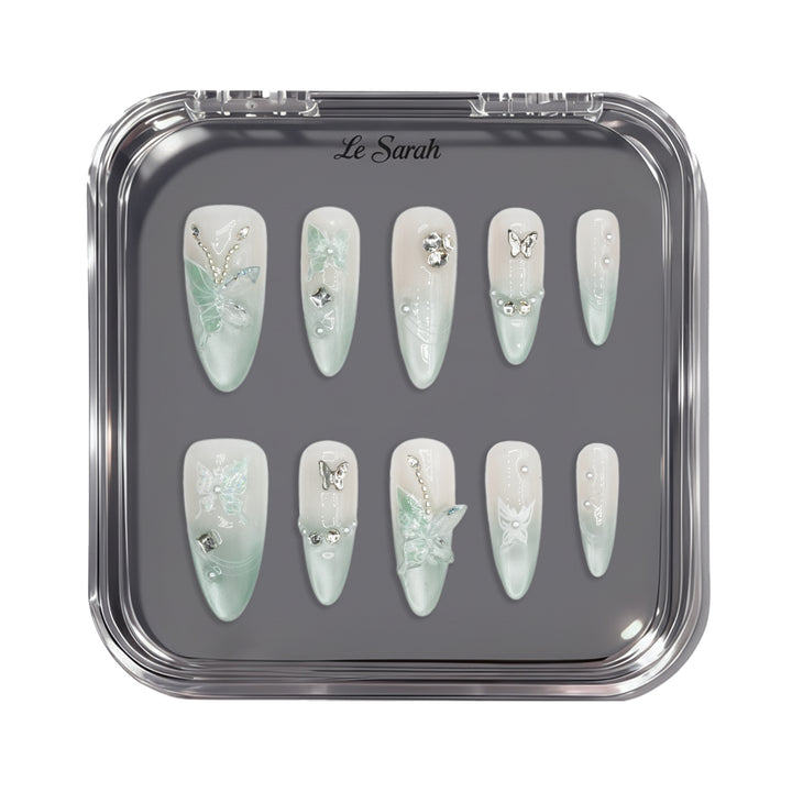 Le Sarah's Minty Waltz captures the grace of a fairytale ball. Part of our Fairytale Collection, this design features a soft mint - hued base adorned with delicate, whimsical silver accents and enchanting motifs. Evoking the elegance of a magical waltz in an enchanted forest, these nails bring a touch of dreamy, ethereal charm to your look.