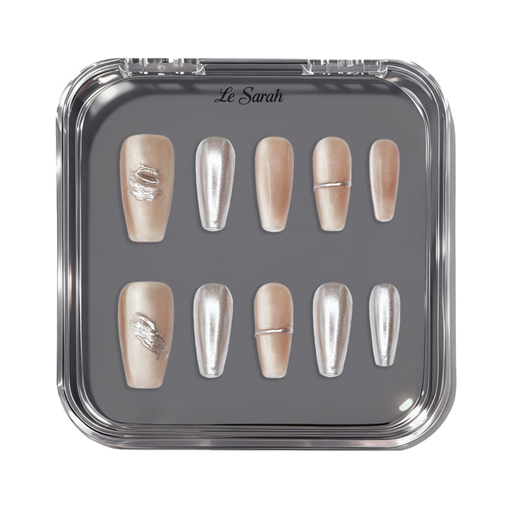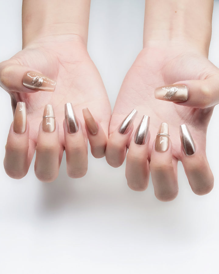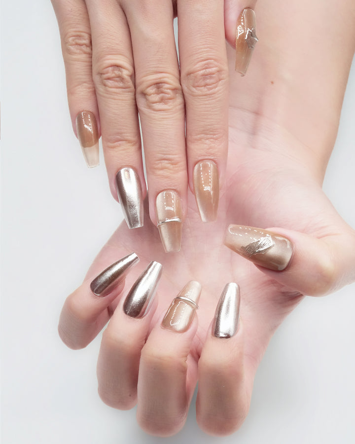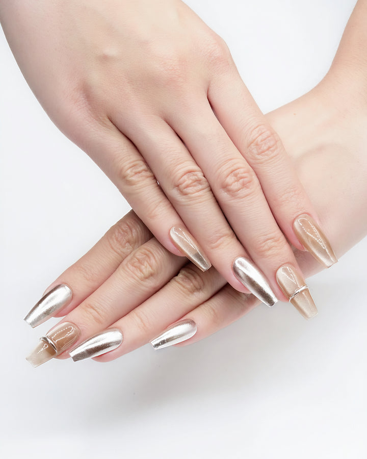 Le Sarah's Mirror Cat-Eye reimagines workplace sophistication with modern glamour. Part of our Work Chic Collection, this design features sleek metallic cat-eye finishes in warm, neutral tones, paired with subtle gradient details and refined linear accents. Evoking the confidence of a leader who balances professionalism with bold style, these nails bring a touch of polished, eye-catching elegance to your workday ensemble—perfect for making a statement in meetings or elevating everyday office attire.
