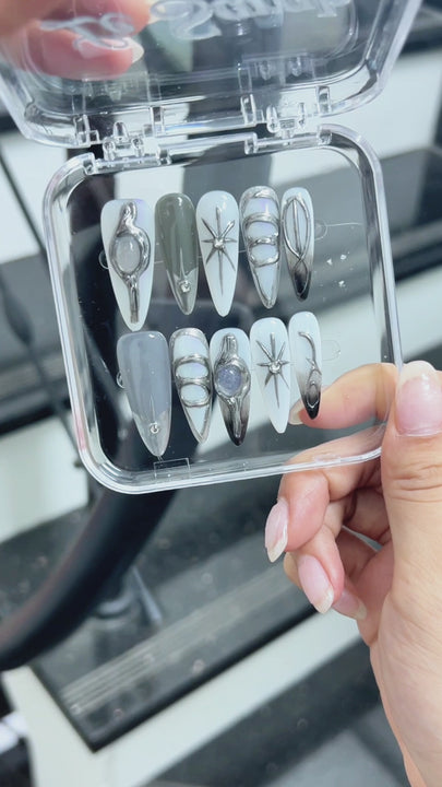 Le Sarah's Mirrorline, a striking piece from our SCI-FI Collection, draws inspiration from futuristic cybernetics and reflective tech aesthetics. This design features sleek, iridescent bases in muted pastels, accented with bold metallic silver structures, geometric cutouts, and luminescent gem details that mimic advanced cybernetic implants. Capturing the essence of a high-tech, avant-garde future, these nails bring an edgy, futuristic charm to your style, perfect for anyone looking to embrace a cyber-inspired, fashion-forward look.