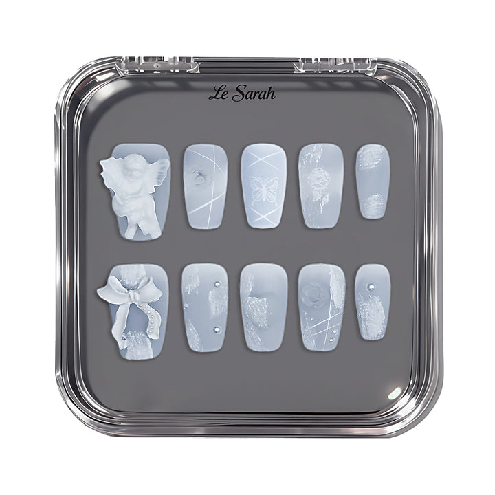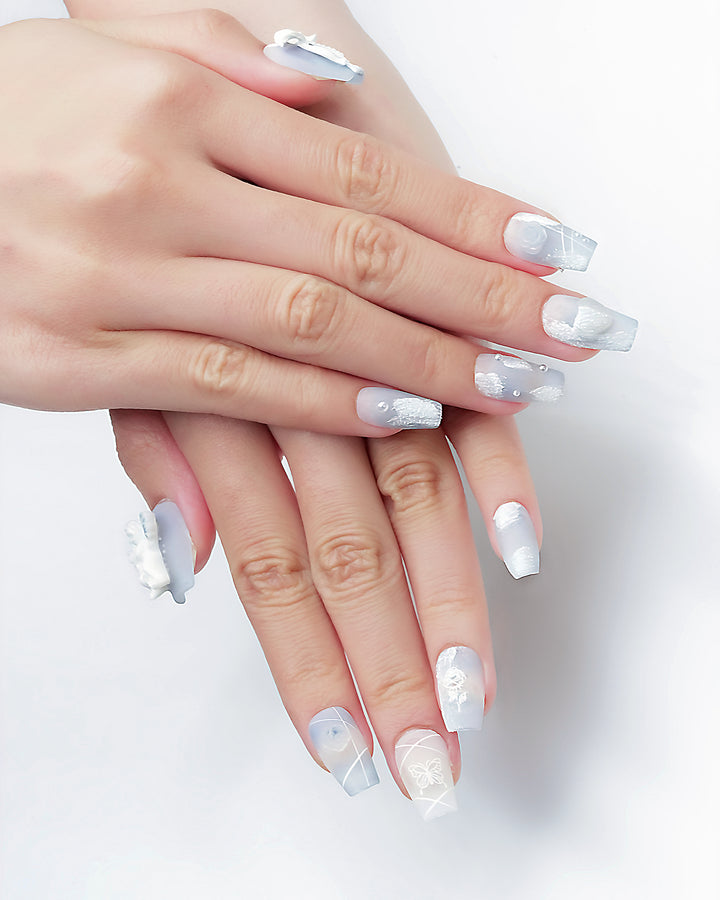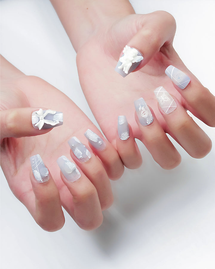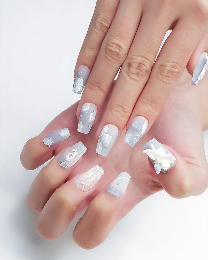 THESE ARE READY-TO-WEAR NAILS DESIGNED WITH RAISED TEXTURES AND SCULPTED ACCENTS THAT YOU CAN APPLY AT HOME. WITH PROPER PREP, A FULL SET CAN BE APPLIED IN ABOUT 10–15 MINUTES. THEY CAN STAY ON FOR UP TO THREE TO FOUR WEEKS WHEN USING NAIL GLUE, OR FOR SEVERAL DAYS WITH ADHESIVE TABS—PERFECT FOR SWITCHING STYLES WHENEVER YOU FEEL LIKE IT.