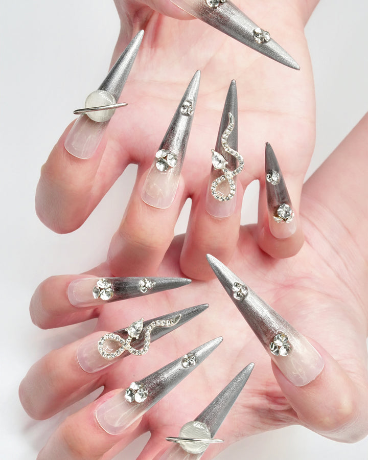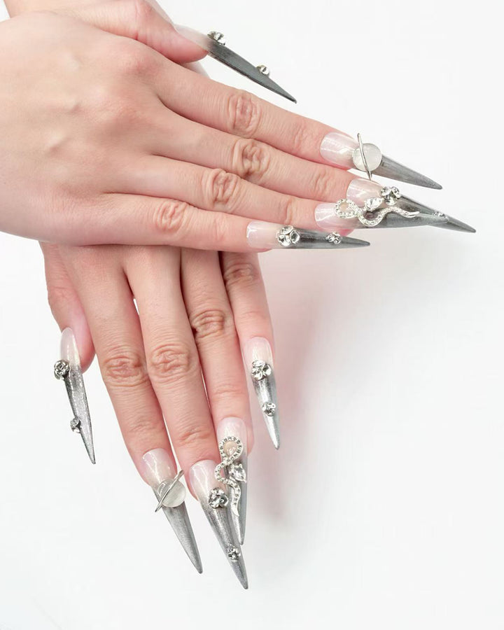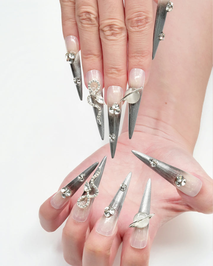THESE ARE READY-TO-WEAR NAILS DESIGNED WITH RAISED TEXTURES AND SCULPTED ACCENTS THAT YOU CAN APPLY AT HOME. WITH PROPER PREP, A FULL SET CAN BE APPLIED IN ABOUT 10–15 MINUTES. THEY CAN STAY ON FOR UP TO THREE TO FOUR WEEKS WHEN USING NAIL GLUE, OR FOR SEVERAL DAYS WITH ADHESIVE TABS—PERFECT FOR SWITCHING STYLES WHENEVER YOU FEEL LIKE IT.