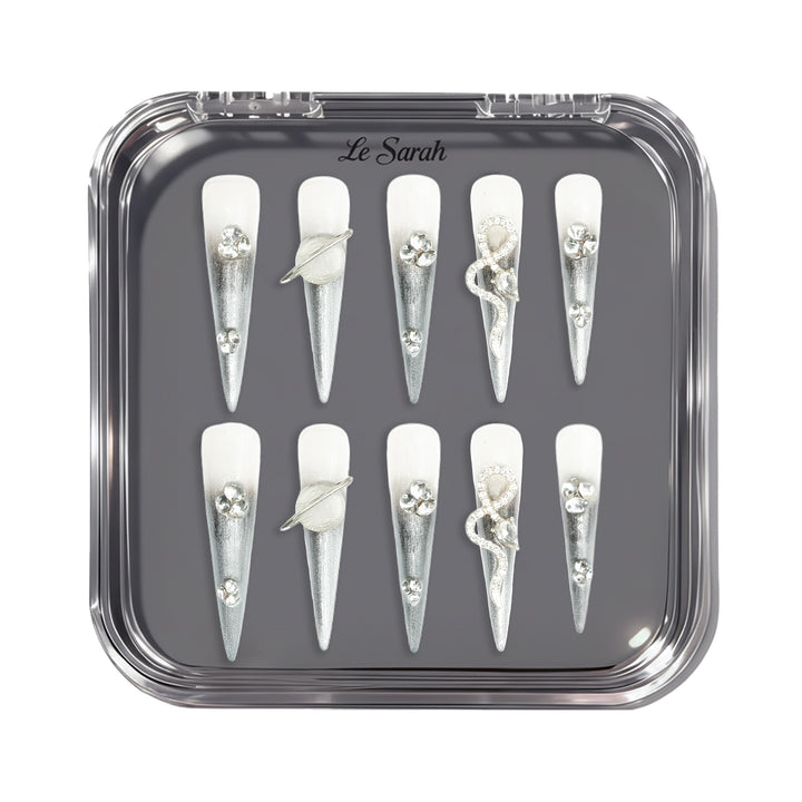 Le Sarah's Moon & Starlight, an elegant piece from our Night Out Collection, blends celestial inspiration with understated glamour. This design features a sleek silver-toned base, adorned with delicate moon, star, and leaf motifs that evoke the serenity of a starlit night. Capturing the essence of refined sophistication, these nails bring a polished, ethereal charm to your evening look, perfect for elevating any upscale or formal ensemble.