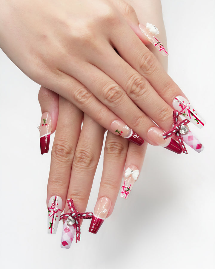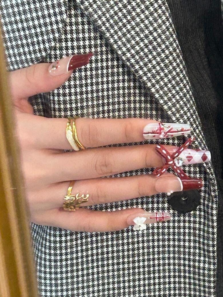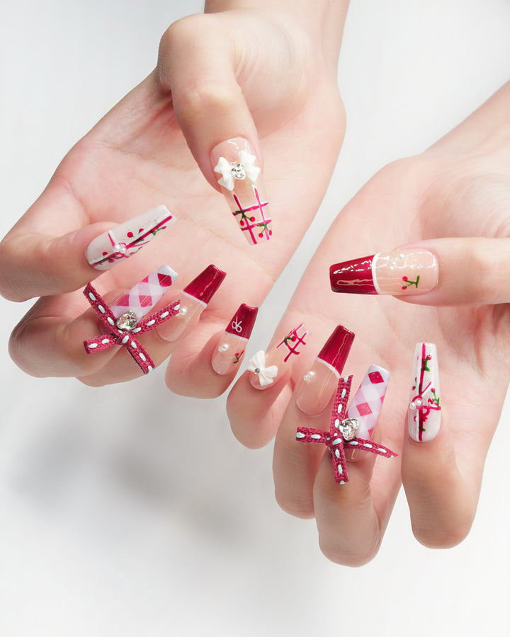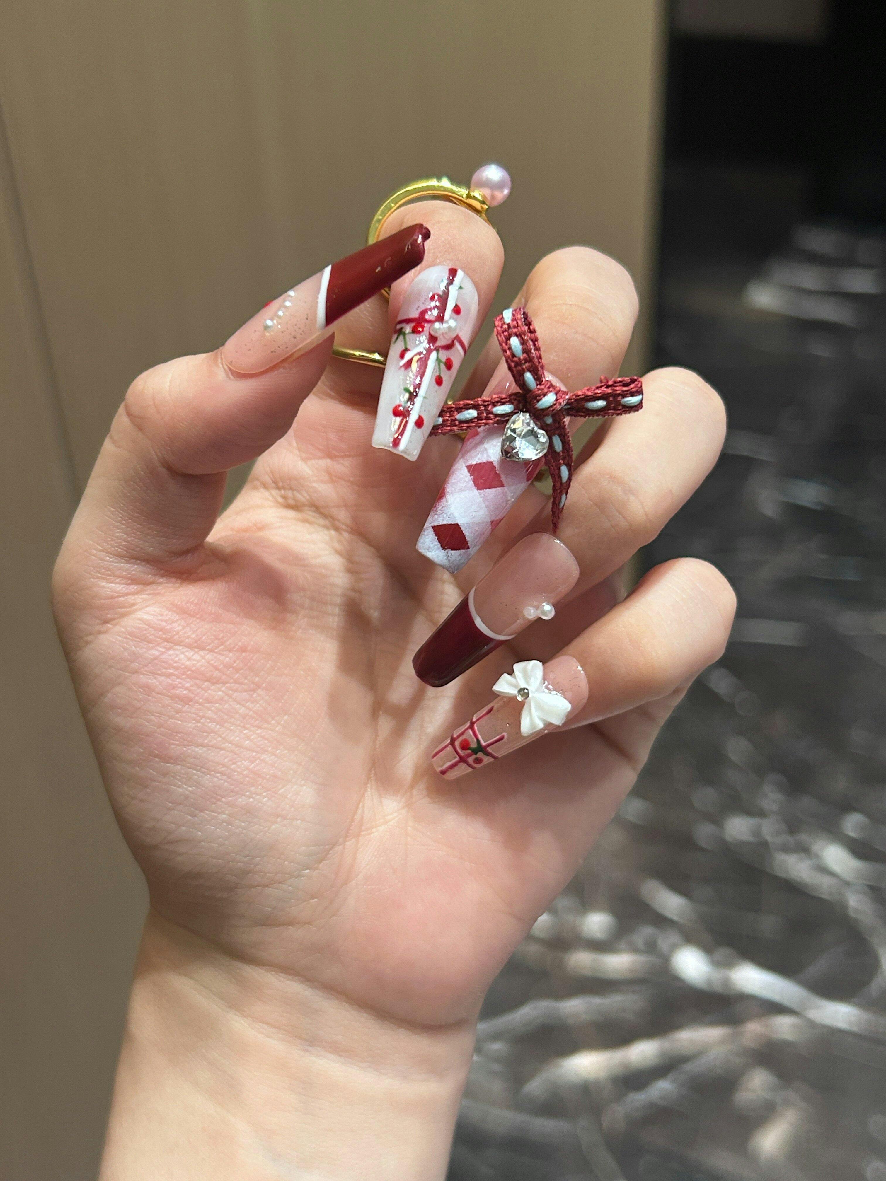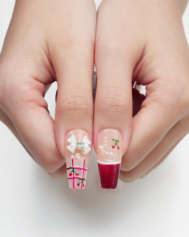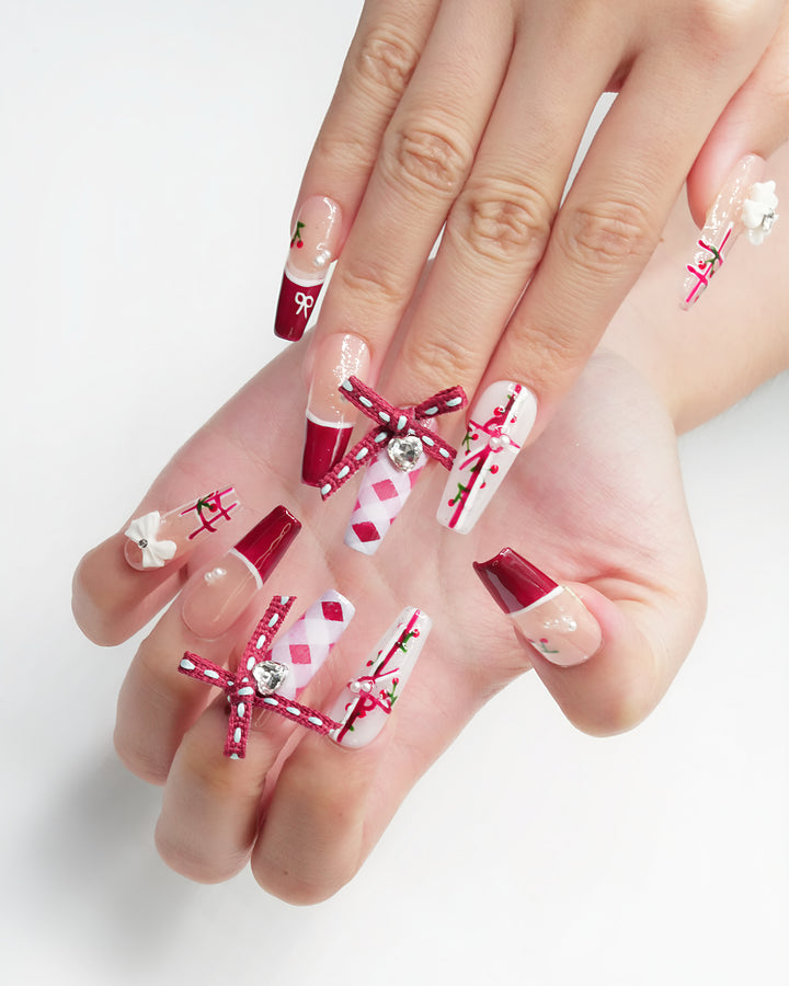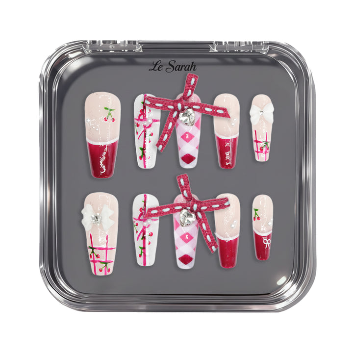 Le Sarah's Candy Cane Charm embodies the sweet magic of Christmas. Part of our Christmas Collection, this design features festive red-and-white color blocking, whimsical candy cane patterns, and charming bow accents. Evoking the warmth of holiday gatherings and the joy of gift-giving, these nails add a playful, cheerful touch to your festive look.