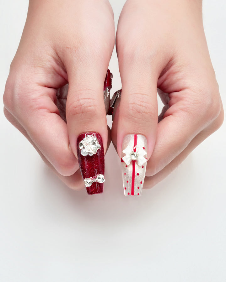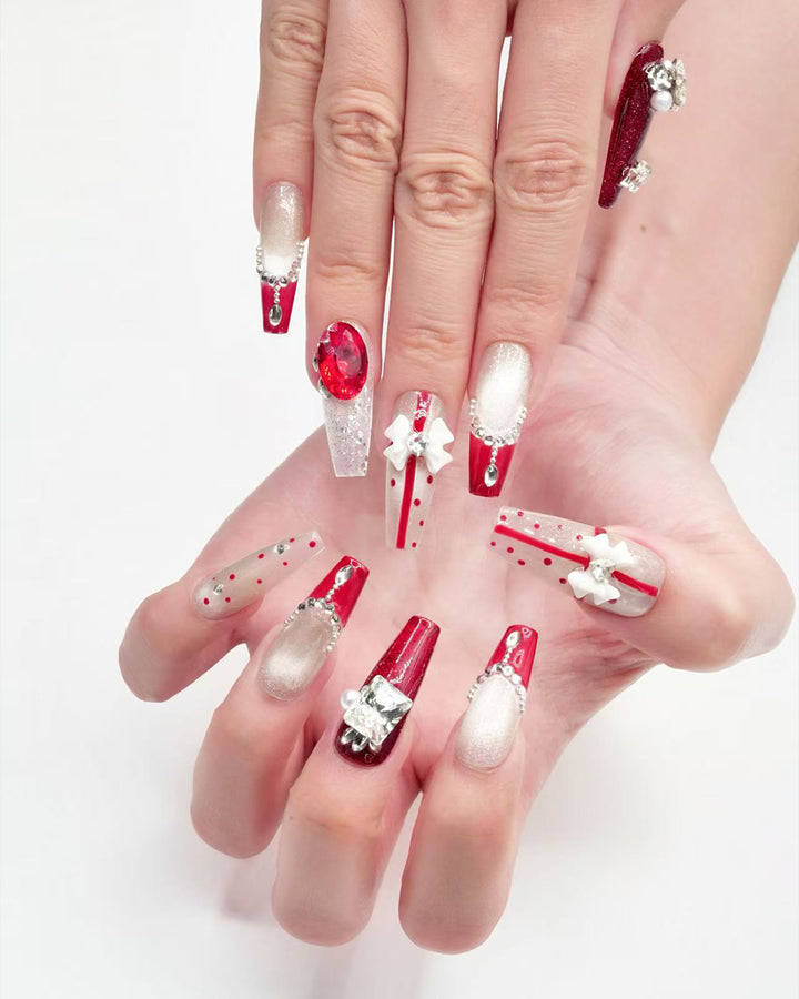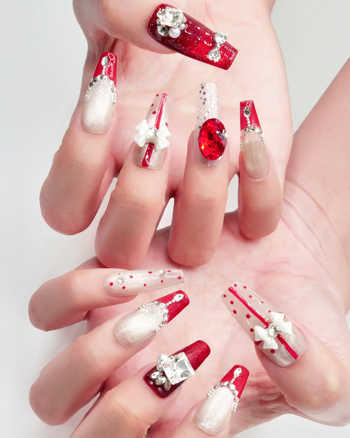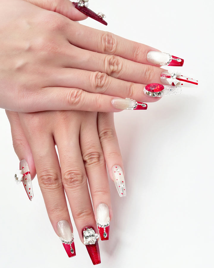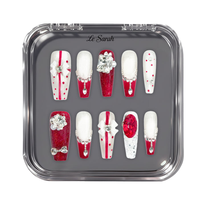 Le Sarah's New Year’s Armor, a festive standout from our Night Out Collection, blends holiday glamour with bold sophistication. This design features a classic red-and-white palette, adorned with sparkling crystal embellishments and chic geometric details that evoke the excitement of New Year’s celebrations. Capturing the essence of celebratory luxury, these nails bring a vibrant, eye-catching charm to your New Year’s Eve or festive night-out look.