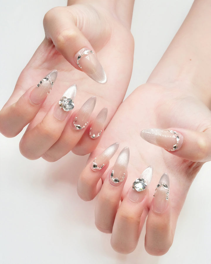 Le Sarah's Nude Étoile, an elegant piece from our Elevated French Collection, blends understated charm with subtle sparkle. This design features soft nude bases adorned with delicate crystal details and star motifs, evoking the refinement of a Parisian atelier. Capturing the essence of polished minimalism, these nails bring a graceful, timeless charm to any ensemble, perfect for those who favor classic elegance with a hint of celestial allure.