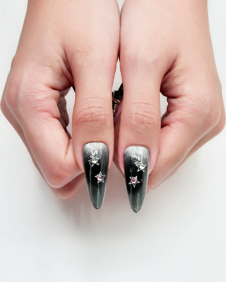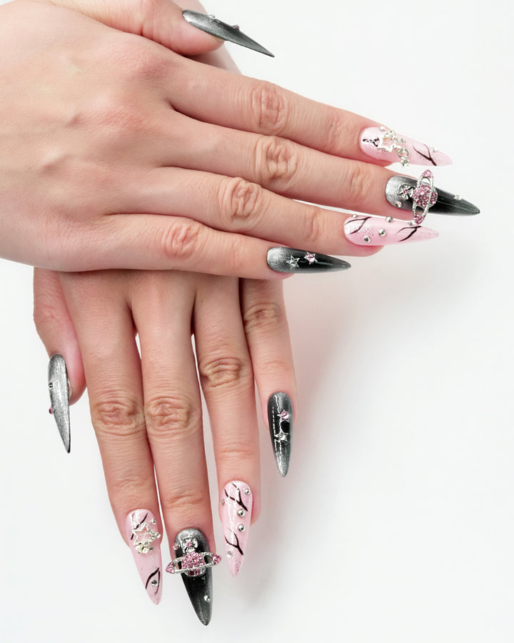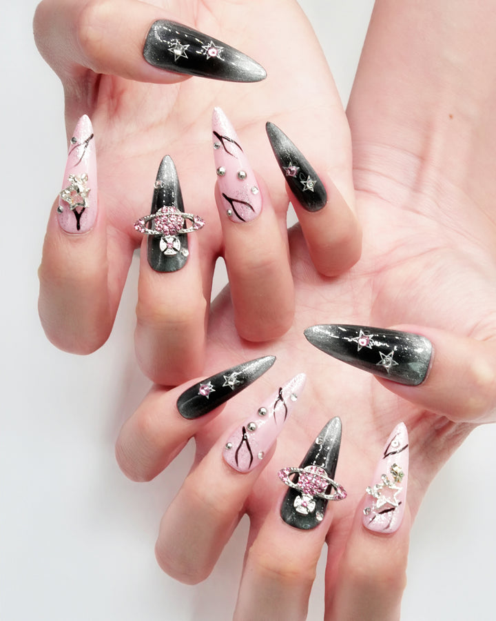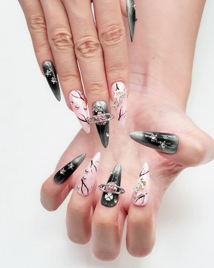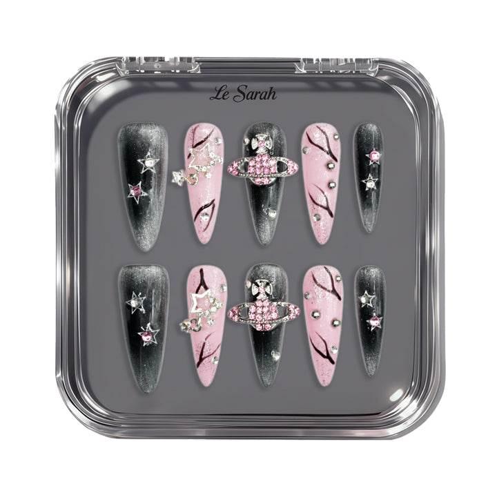 Le Sarah's Orbiting Planet, a playful yet chic design from our Night Out Collection, merges cosmic inspiration with evening glamour. This design features a sleek black-and-pink gradient base, adorned with shimmering star motifs and orbital crystal details that evoke the mystery of the night sky. Capturing the essence of whimsical sophistication, these nails bring a unique, eye-catching charm to your night-out look, perfect for those who love to blend edgy style with festive sparkle.