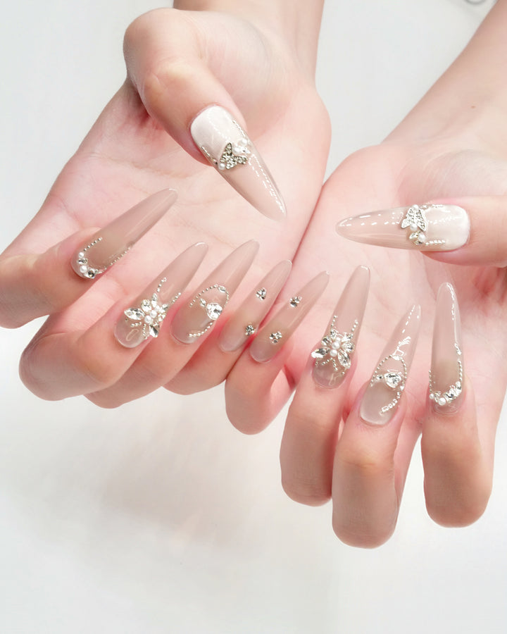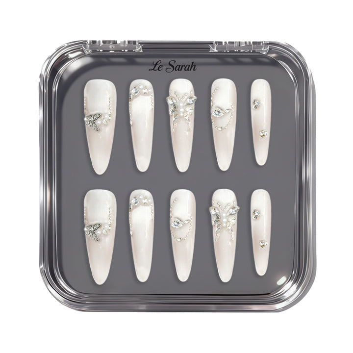 Le Sarah's Paris Nude, an elegant offering from our Elevated French Collection, blends understated sophistication with delicate artistry. This design features soft nude bases adorned with intricate crystal butterfly motifs and subtle rhinestone details, evoking the timeless chic of Parisian style. Capturing the essence of refined minimalism, these nails bring a polished, graceful charm to any ensemble, perfect for those who favor classic elegance with a touch of sparkle.