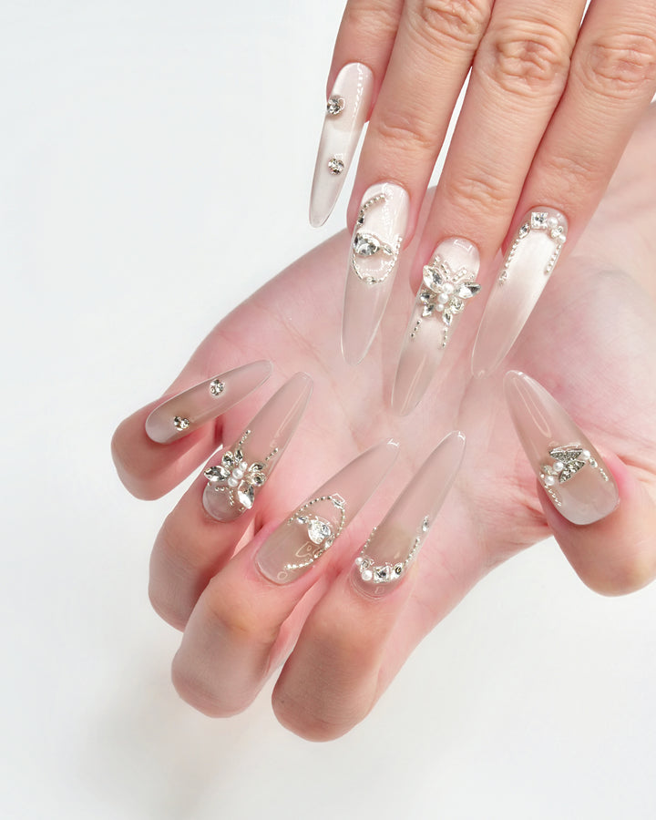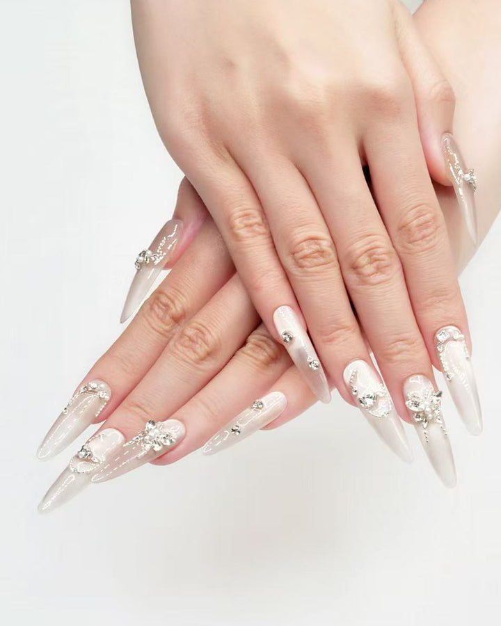 THESE ARE READY-TO-WEAR NAILS DESIGNED WITH RAISED TEXTURES AND SCULPTED ACCENTS THAT YOU CAN APPLY AT HOME. WITH PROPER PREP, A FULL SET CAN BE APPLIED IN ABOUT 10–15 MINUTES. THEY CAN STAY ON FOR UP TO THREE TO FOUR WEEKS WHEN USING NAIL GLUE, OR FOR SEVERAL DAYS WITH ADHESIVE TABS—PERFECT FOR SWITCHING STYLES WHENEVER YOU FEEL LIKE IT.