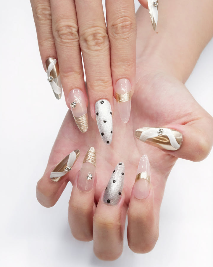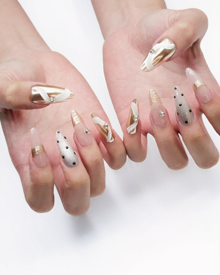 THESE ARE READY-TO-WEAR NAILS DESIGNED WITH RAISED TEXTURES AND SCULPTED ACCENTS THAT YOU CAN APPLY AT HOME. WITH PROPER PREP, A FULL SET CAN BE APPLIED IN ABOUT 10–15 MINUTES. THEY CAN STAY ON FOR UP TO THREE TO FOUR WEEKS WHEN USING NAIL GLUE, OR FOR SEVERAL DAYS WITH ADHESIVE TABS—PERFECT FOR SWITCHING STYLES WHENEVER YOU FEEL LIKE IT.