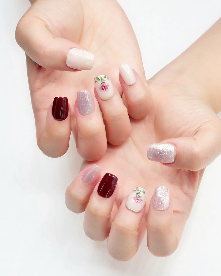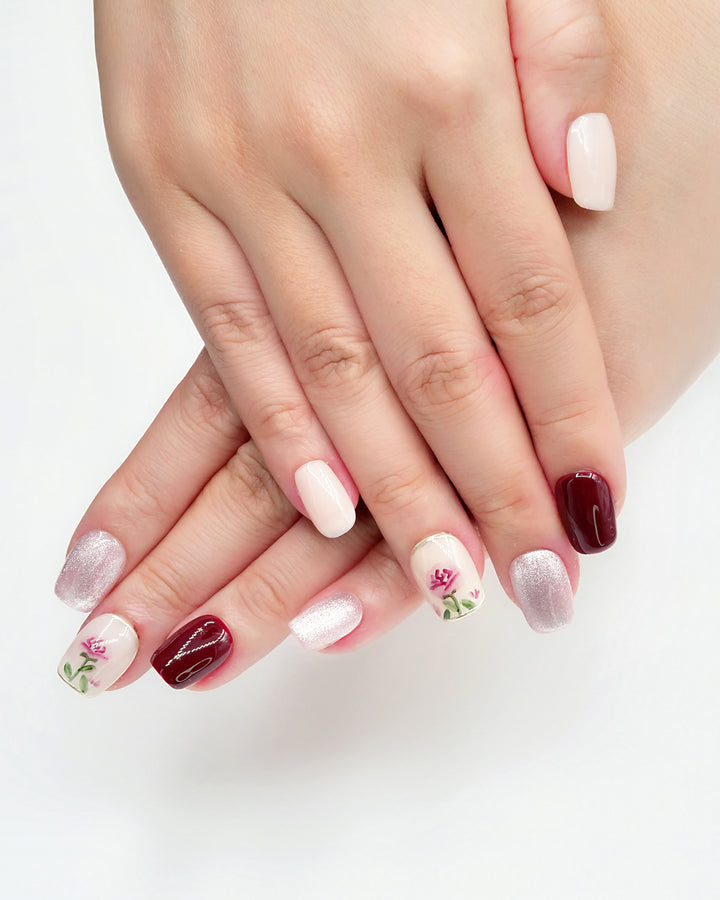 THESE ARE READY-TO-WEAR NAILS DESIGNED WITH RAISED TEXTURES AND SCULPTED ACCENTS THAT YOU CAN APPLY AT HOME. WITH PROPER PREP, A FULL SET CAN BE APPLIED IN ABOUT 10–15 MINUTES. THEY CAN STAY ON FOR UP TO THREE TO FOUR WEEKS WHEN USING NAIL GLUE, OR FOR SEVERAL DAYS WITH ADHESIVE TABS—PERFECT FOR SWITCHING STYLES WHENEVER YOU FEEL LIKE IT.