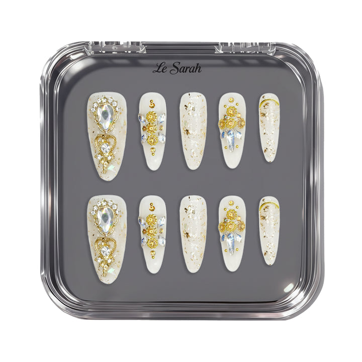 Le Sarah's 'royal gilded charm' weaves a tale of enchanted royalty. part of our 'Fairytale collection', this design features ornate gilded patterns dancing across a regal base, as if touched by a fairy's magic wand. each intricate detail tells a story of palace ballrooms and golden spellbooks, bringing a touch of storybook luxury to your fingertips.