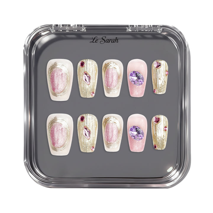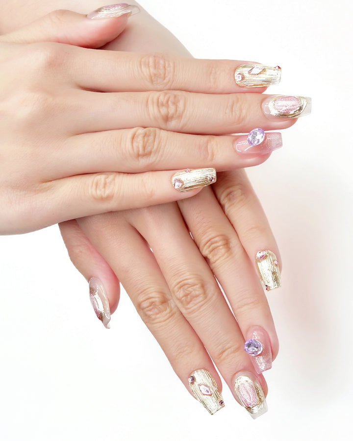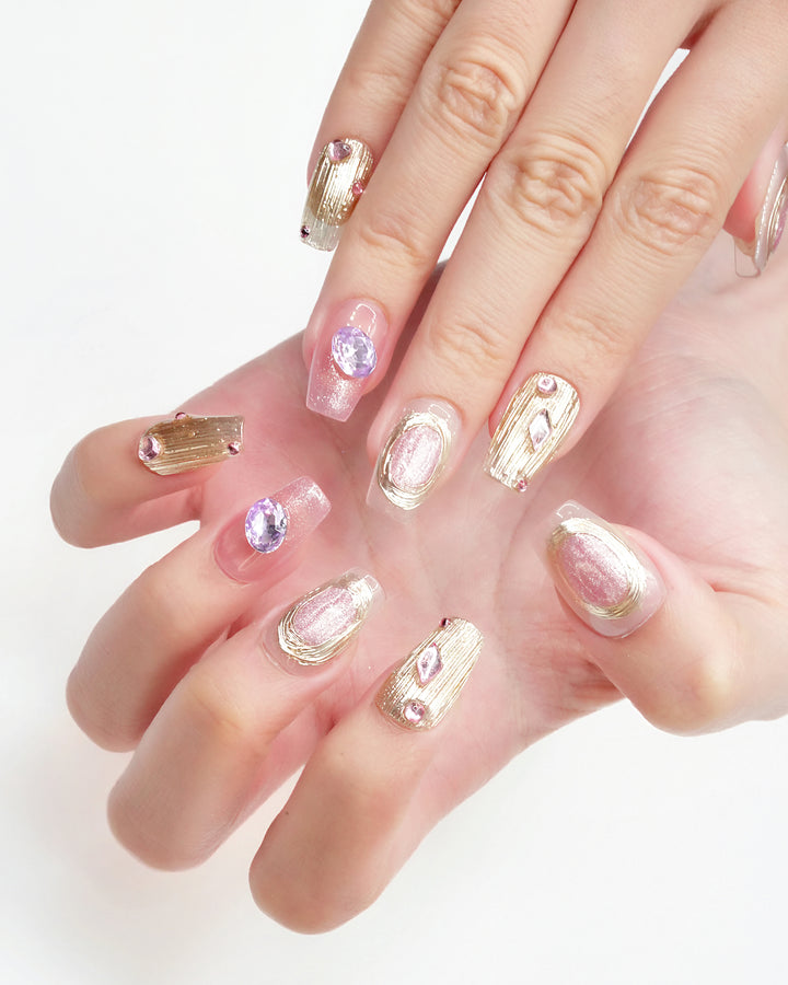 THESE ARE READY-TO-WEAR NAILS DESIGNED WITH RAISED TEXTURES AND SCULPTED ACCENTS THAT YOU CAN APPLY AT HOME. WITH PROPER PREP, A FULL SET CAN BE APPLIED IN ABOUT 10–15 MINUTES. THEY CAN STAY ON FOR UP TO THREE TO FOUR WEEKS WHEN USING NAIL GLUE, OR FOR SEVERAL DAYS WITH ADHESIVE TABS—PERFECT FOR SWITCHING STYLES WHENEVER YOU FEEL LIKE IT.
