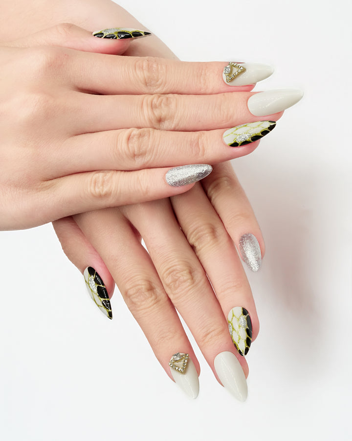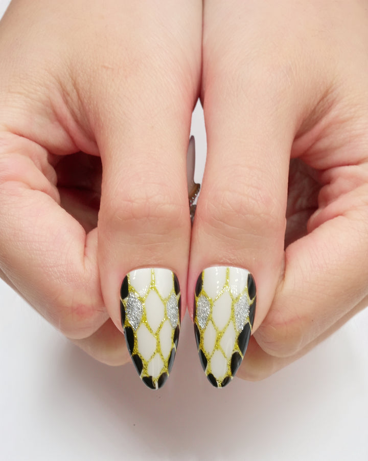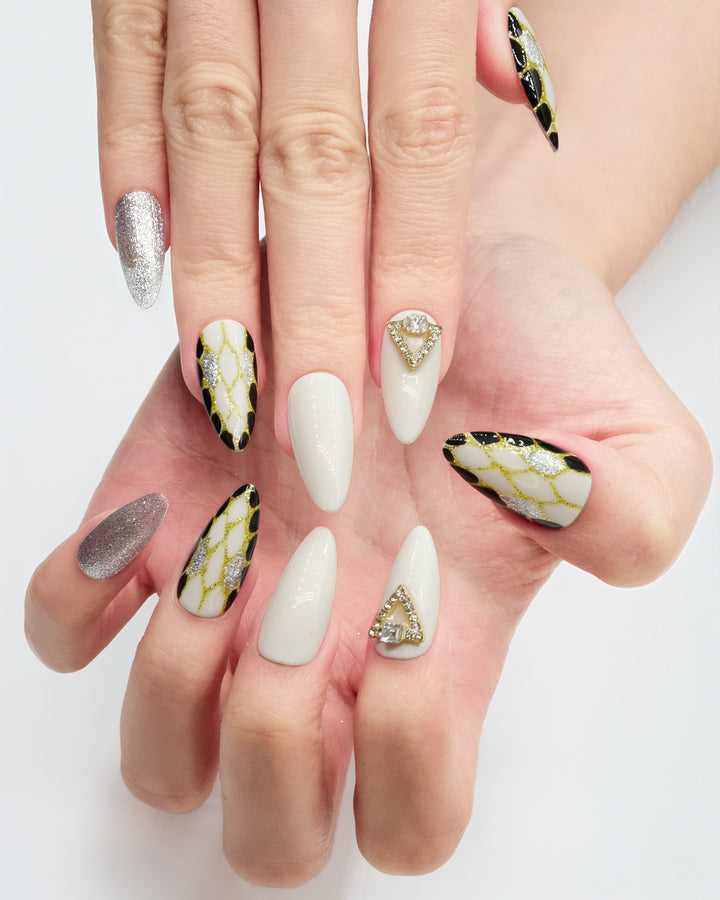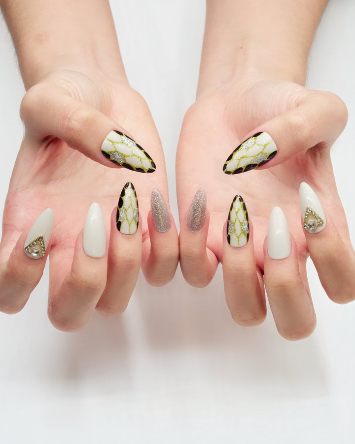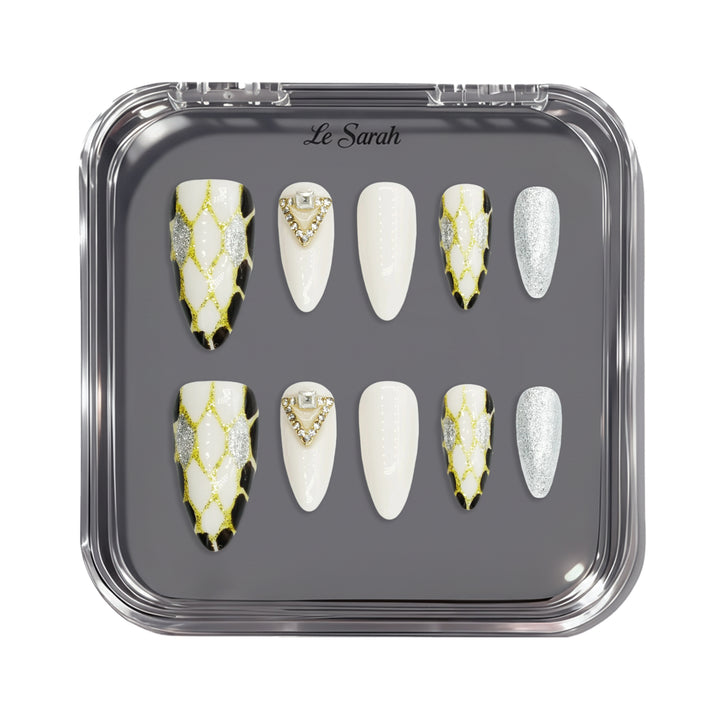 Le Sarah's Starborn Realm brings the magic of a fairytale cosmos to your fingertips. Part of our Fairytale Collection, this design features a pristine white base adorned with shimmering gold web-like patterns, sleek black accents, and dazzling crystal embellishments. Evoking the enchantment of a star-born realm where fantasy and elegance collide, these nails are perfect for adding a touch of otherworldly charm to your look.